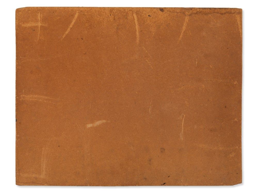 The calligraphy is in good condition, showing light framing marks and craquelure on the paint surface. The gilt stucco frame shows dryness cracks and some material losses. The overall dimensions, framed, 65.5 x 76.5 cm. The hardboard measures 58.5 x 46 cm.