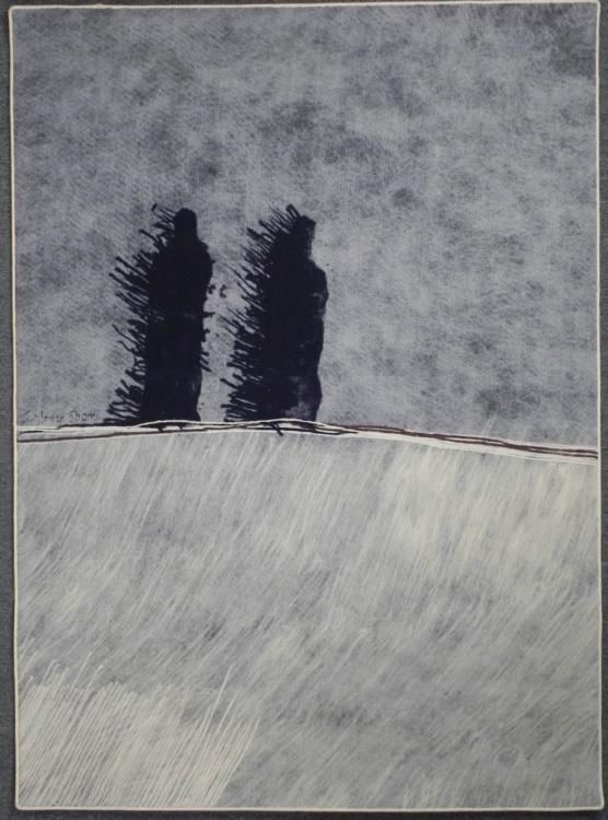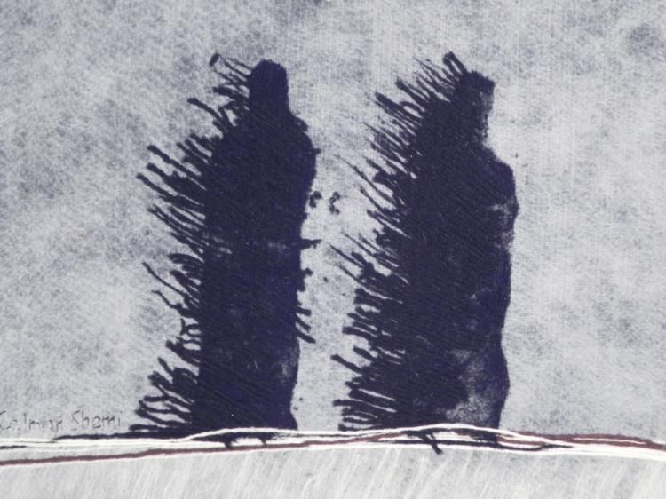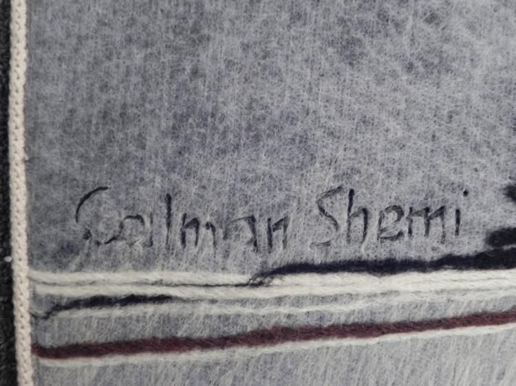 This is a soft painting portraying two dark and mysterious figures traveling a windswept landscape. * * Artist: Calman Shemi Signature: Center, leftMedium: Woven and printed fabricSize: 61 x 45 inchesCondition: Excellent * * * * Biography: * * * Sculptor and painter Calman Shemi was born in Argentina in 1939, and settled in Israel in 1961. He has a background in art and sculpture, developed the soft painting in 1977, and currently works with wall sculptures of laser-cut steel. He has also created large-scale paintings for Carnival Cruise liners, and has earned an international reputation for evoking worldwide peace and tranquility with his works; they have been repeatedly given as gifts by the state of Israel during peace negotiations. *