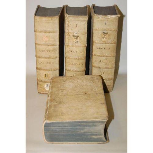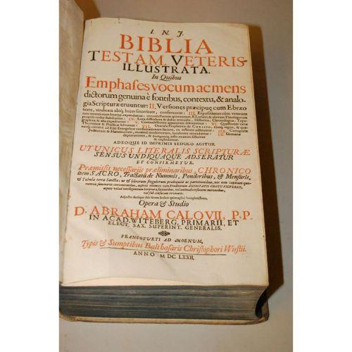 Calovii, D. Abraham (Calov) (Calovius) [1612-1686]. CALOV BIBLE. Biblia Testam. Veteris Illustrata & Biblia Novi Testamenti Illustrata- 5 Volumes in 4. Francofurti Ad Moenum: Typis & Sumptibus Balthasaris Christophori Wustii, Folio - over 12" - 15" tall. Hard Cover. Ex-Library. Very Good Condition. SCARCE. 1672-1676. Abraham Calovius was a Lutheran theologian and one of the champions of Lutheran othodoxy in the 17th century. The Calov Bible was made famous by the discovery of a long lost copy once owned by J.S. Bach, which he used, to set music to Bible text. Bound in blind stamped vellum, raised bands on spine, 2 double-page maps, 4 copper engraved portraits, with bindings and hinges tight. **1) 2 leaves (one has handwritten notations), half-title [1] frontis [1] title in red & black [1] 11 leaves, 1334pp. **2) 2ffp, title in black [1] 5 leaves, 1076pp 282pp, 58 leaves, 2 free endpapers. **3) 2 ffp, half-title [1] title in red & black [1] 12 leaves, 956pp, 420pp, 2 leaves, 2 free endpapers. **4) 2ffp, 421-1924pp, 22 leaves, 2 free endpapers. Occasional foxing, some wear to upper/lower backstrips, chip on one backstrip.