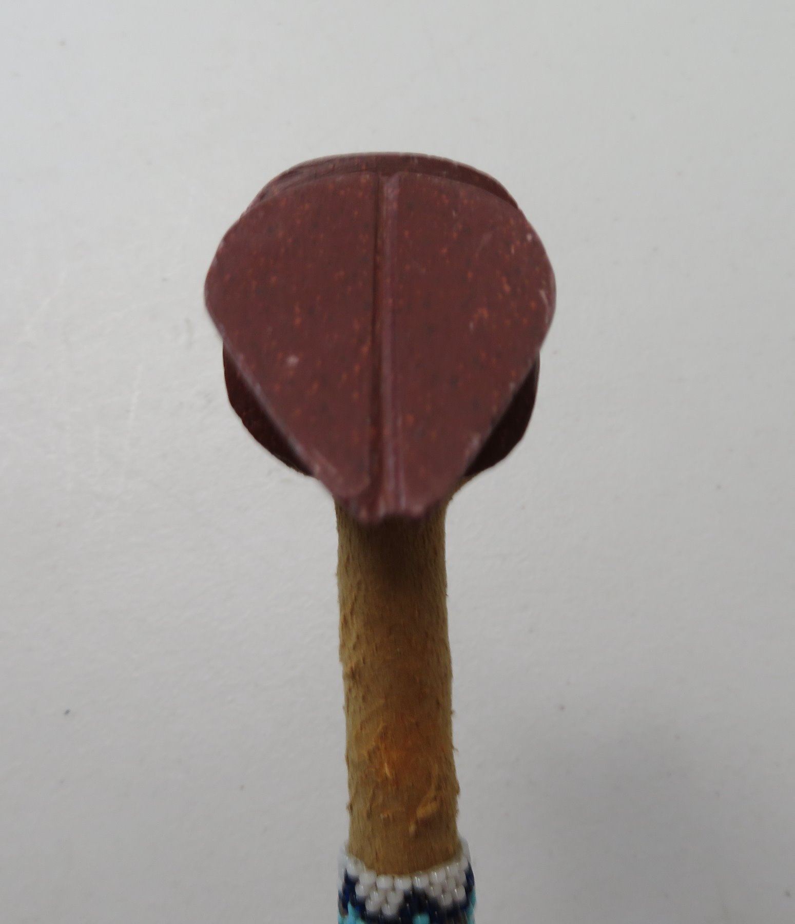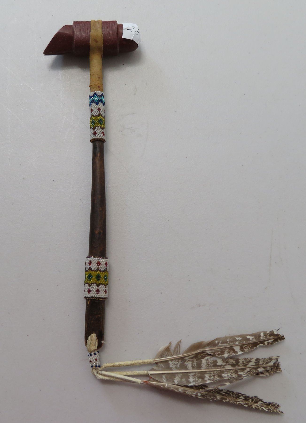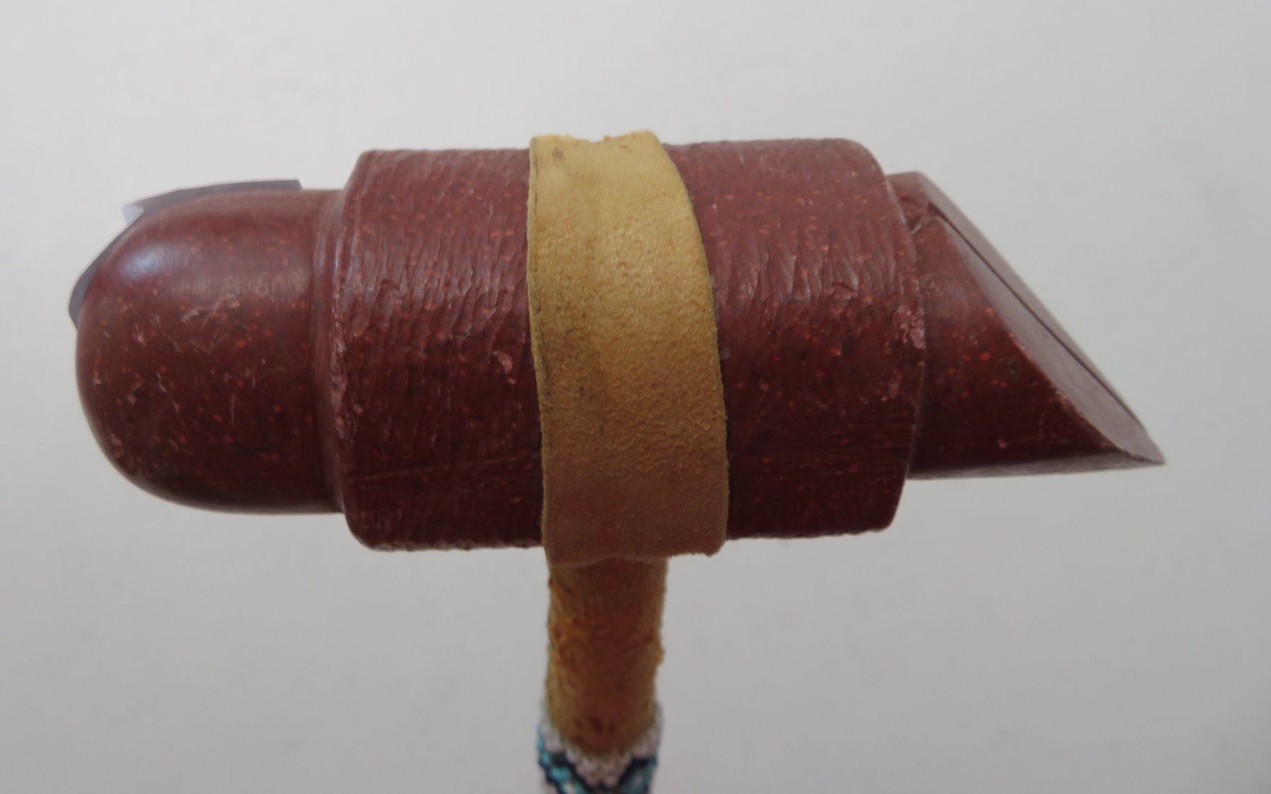 Catlinite Dance Club, 20th century item. Made of catlinite, glass beads, leather, and feathers, the item measures 14 1/2" long x 4 1/2" not including feathers. Minnesota. Clubhead in the shape of an animal foot. Condition: Good, see images. Shipping: $30.00 w/insurance and signature.