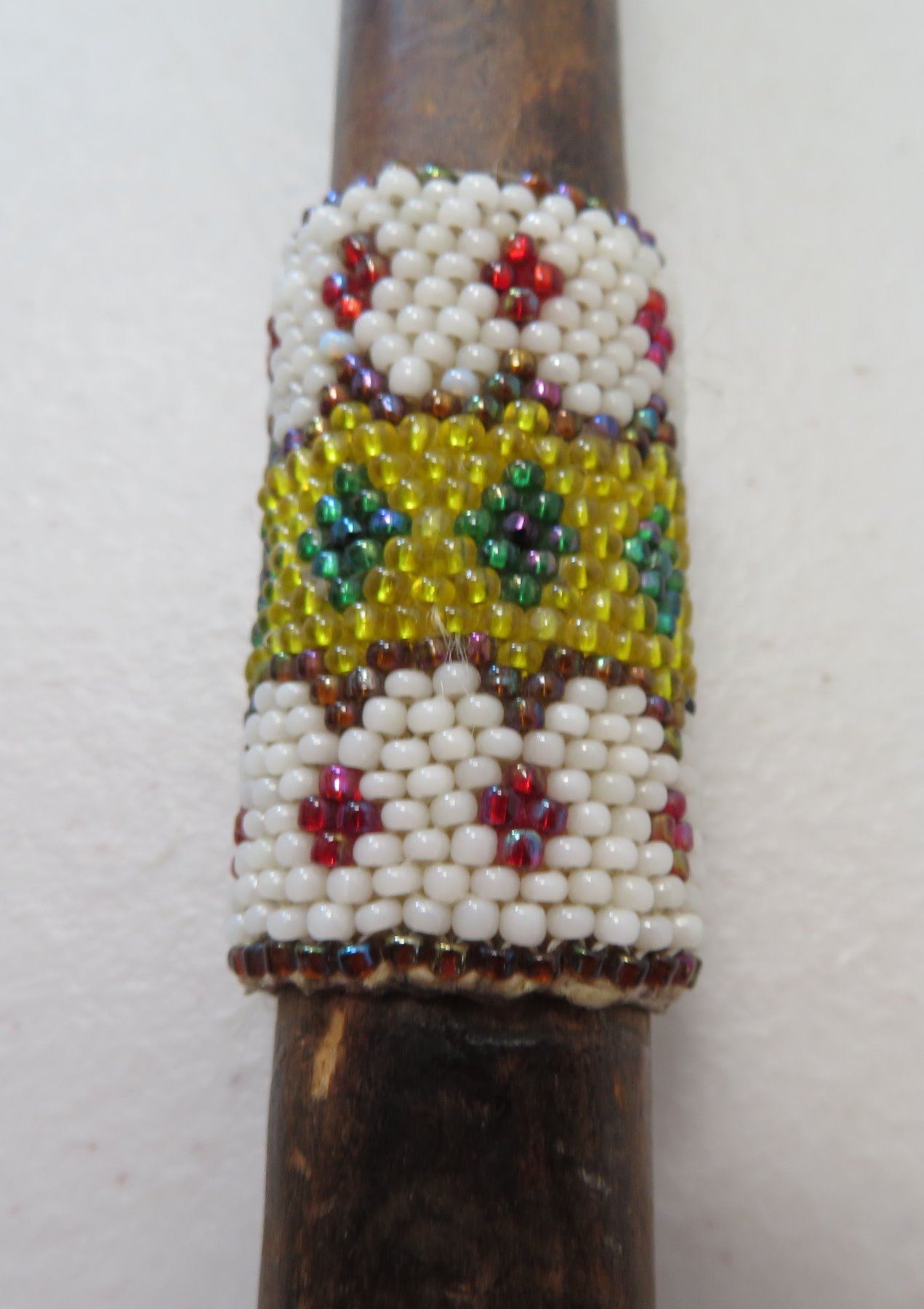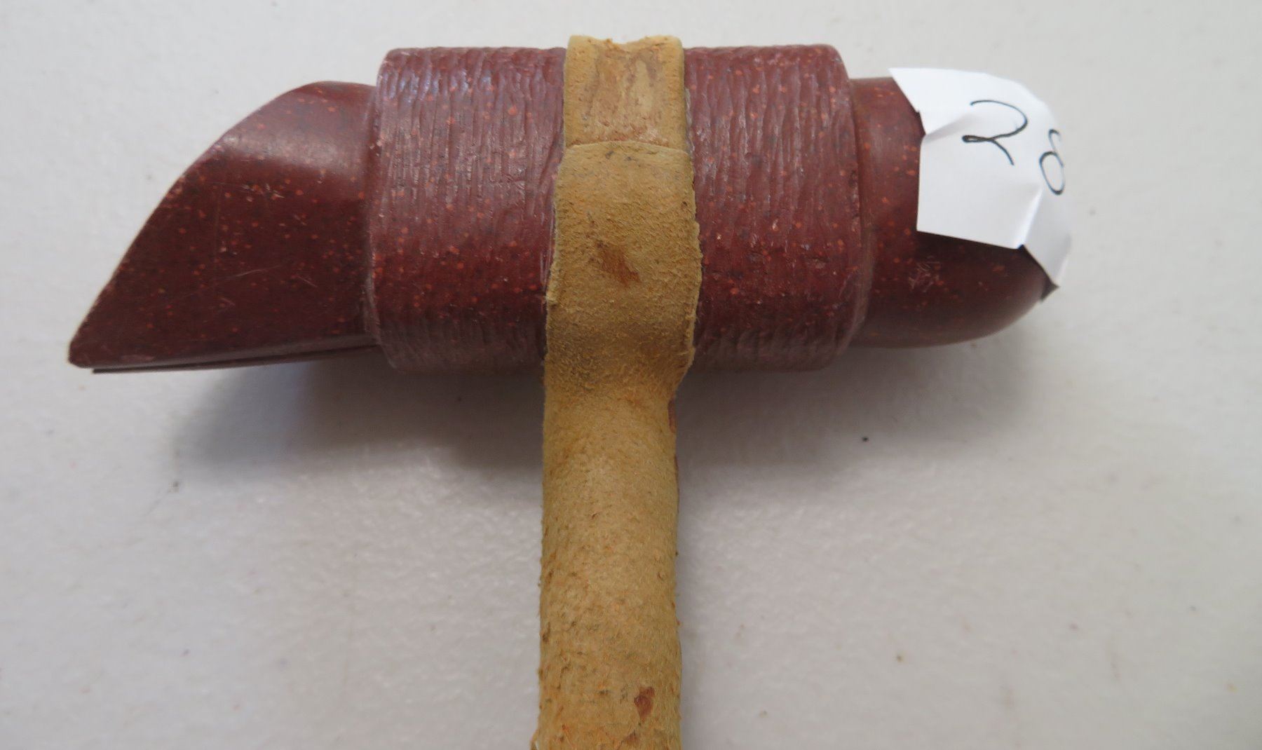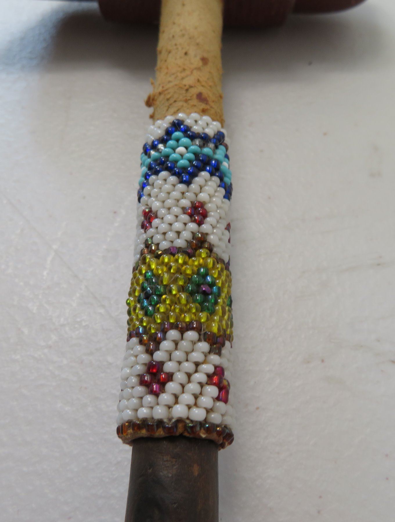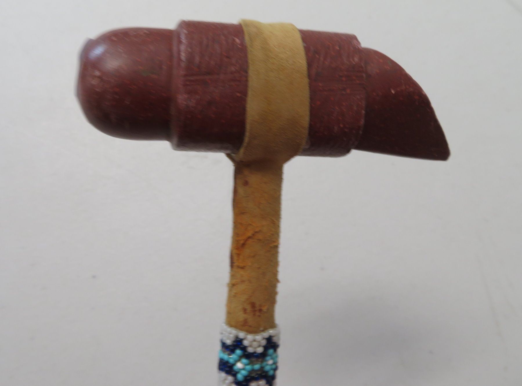 Catlinite Dance Club, 20th century item. Made of catlinite, glass beads, leather, and feathers, the item measures 14 1/2" long x 4 1/2" not including feathers. Minnesota. Clubhead in the shape of an animal foot. Condition: Good, see images. Shipping: $30.00 w/insurance and signature.