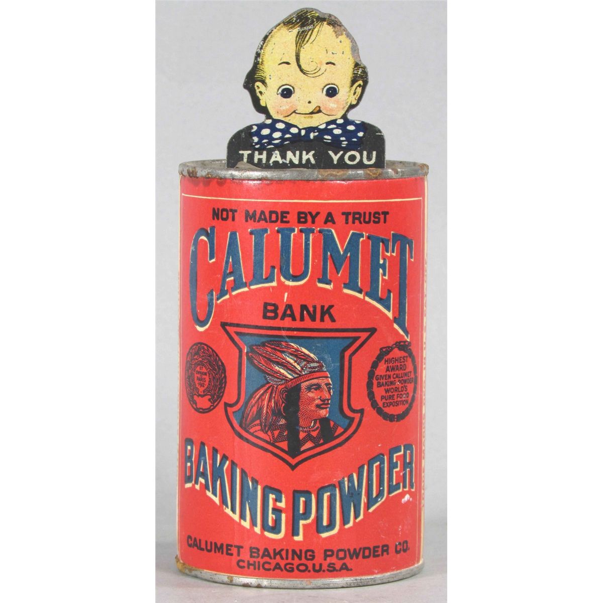 Calumet Baking Powder Bank with tin litho dye cut "Thank you" bobber. Paper label. Very good condition. Can measures 4 inches tall w/o bobber. Start Price $20