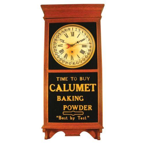 Calumet Baking powder clock, oak cabinet. Minor stain around key hole on face otherwise excellent condition. 18 X 38 inches.