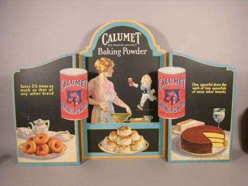 Calumet Baking Powder - large die cut - 3D cardboard store window display, set up 42"W x 27" tall, near mint - hole at top/bends at top/corners.