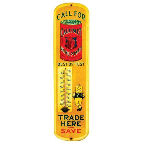Calumet Baking Powder Wood Thermometer. Some wear to paint otherwise very good condition. 6 X 22 inches.