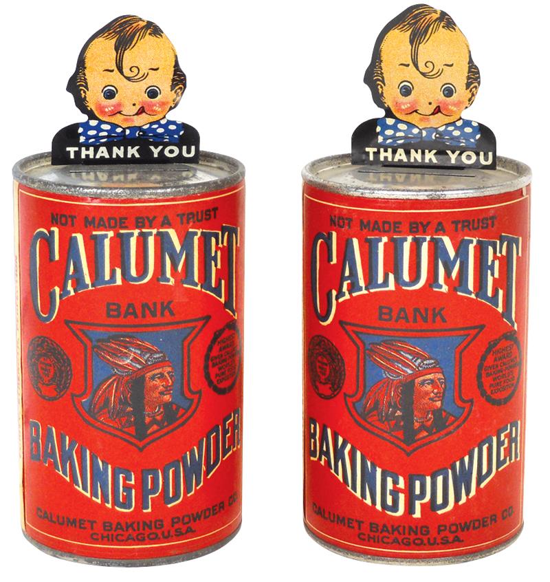 Calumet Baking Powder banks (2), paper over metal can w/orig metal bobbing-head, when coin is deposi