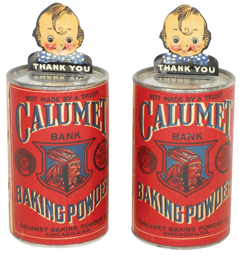 Calumet Baking Powder banks (2), paper over metal can w/orig metal bobbing-head, when coin is deposited in slot, head bobs back & forth to say "Thank You", given to children in the early 1900's, both in Exc cond & 5.5"H.
