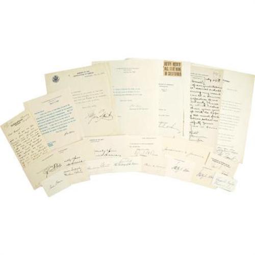 <B>Calvin Coolidge Administration Autograph Lot.</B></I> This lot of autograph materials from the Coolidge Administration (1923-1929) includes:<BR><B>Secretary of War Dwight F. Davis</B></I> Signed War Dept. card, 3” x 5”, 1928, glued to another sheet, very good condition; <I>and</B></I> signed War Dept. card, 3” x 5”, 1929, fine condition<BR><B>Secretary of Labor James J. Davis</B></I> Two signed index cards, 1928, glued to other sheets, both in very good condition<BR><B>Vice President Charles G. Dawes</B></I> Signed card, 1928, 2” x 3”, fine condition<BR><B>U.S. Ambassador Myron T. Herrick</B></I> TLS, December 1, 1915, Society for Savings letterhead, very good condition; TLS, August 26, 1925, very good condition; TLS, July 21, 1927, U.S. Embassy letterhead, good condition; <I>and</B></I> TLS, November 24, 1927, hotel letterhead, good condition<BR><B>Secretary of Commerce Herbert Hoover</B></I> TLS, July 7, 1928, D.O.C. letterhead, glued to another sheet, very good condition<BR><B>Secretary of State Charles Evans Hughes</B></I> Signed card, 1928, 1.5” x 3”, fine condition; <I>and</B></I> TLS, April 3, 1929, law office letterhead, good condition<BR><B>Secretary of Agriculture William M. Jardine</B></I> Three signed index cards, 1928-1931, with two envelopes, all in very good condition<BR><B>Secretary of State Frank B. Kellogg</B></I> ALS, August 2 (c. 1925-29), Waldorf-Astoria letterhead, fine condition; <I>and</B></I> signed card, 1928, 2.5” x 3.5”, fine condition<BR><B>Secretary of the Treasury Andrew Mellon</B></I> TLS, October 22, 1928, D.O.T. letterhead, with envelope, very good condition; TLS, August 7, 1930, D.O.T. letterhead, with envelope, good condition; <I>and</B></I> Signed card, 1928, 1.5” x 3”, fine condition<BR><B>Postmaster General Harry S. New</B></I> Two signed P.G. cards, 1928-29, 2.5” x 3.75”, both in fine condition<BR><B>Attorney General John G. Sargent</B></I> Signed card, 1928, 2.5” x 3.75”, fine condition<BR><B>Attorney General Harlan F. Stone</B></I> Two signed cards, c. 1924-25, 2” x 3.25”, both in very good condition<BR><B>Secretary of War John W. Weeks</B></I> Signed War Dept. card, c. 1923-25, 3” x 5”, very good condition<BR><B>Secretary of the Interior Roy D. West</B></I> Signed D.O.I. card, 1928, 1.75” x 3”, fine condition<BR><B>Secretary of Commerce William F. Whiting</B></I> Signed card, 1928, 1.5” x 3”, very good condition<BR><B>Secretary of the Navy Curtis D. Wilbur</B></I> Signed D.O.N. card, 1929, 3.5” x 5”, fine condition<BR><B>Speaker of the House Nicholas Longworth</B></I> TLS, April 3, 1928, House of Rep. letterhead, very good condition; <I>and</B></I> TLS, February 23, 1929, House of Rep. letterhead, glued to another sheet, very good condition<BR><B>Representative Gale H. Stalker</B></I> TLS, September 29, 1924, House of Rep. letterhead, very good condition<BR><B>Senate Finance Committee Chairman Reed Smoot</B></I> TLS, April 6, 1928, U.S. Senate letterhead, very good condition<BR><B>Representative Hamilton Fish, Jr.</B></I> TLS, November 25, 1927, House of Rep. letterhead, very good condition<BR><B>Representative John W. Davis</B></I> ALS, July 29, 1913, House of Rep. letterhead, good condition<BR><B>Diplomat Owen D. Young</B></I> TLS, January 24, 1930, personal letterhead, with envelope, good condition with smeared signature<BR><B>Texas Governor Miriam A. Ferguson</B></I> TLS, February 5, 1926, State of Texas letterhead, very good condition<BR><B>Senate Interoceanic Canal Chairman Walter E. Edge</B></I> TLS, January 5, 1926, U.S. Senate letterhead, very good condition<BR><B>Commissioner of Internal Revenue D. H. Blair</B></I> TLS, February 12, 1927, Treasury Dept. letterhead, good condition<BR><B>American Consul Eliot B. Coulter</B></I> TLS, February 27, 1925, American Consular Service letterhead, good condition. <I>From the collection of Henry E. Luhrs.</B></I><BR><BR><b>Shipping:</b> Miscellaneous Collectibles, Smal (<a target="_blank" href="http://www.heritageauctions.com/common/shipping.php">view shipping information</a>)