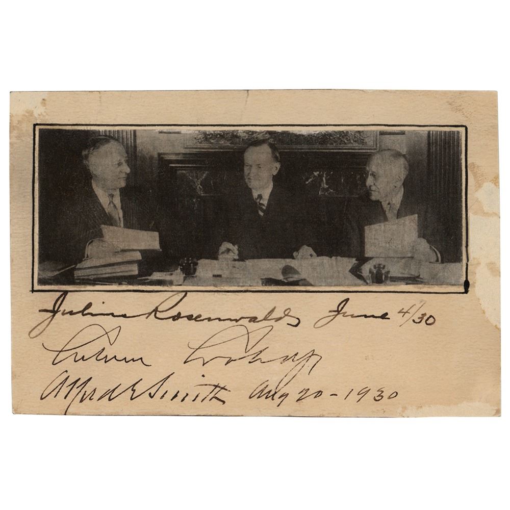 Fountain pen signatures, “Calvin Coolidge,” “Alfred E. Smith, Aug 20–1930,” and “Julius Rosenwald, June 4/30,” on an off-white 5.25 x 3.5 card bearing an affixed image of all three men seated at a table together. The card is affixed to a same-size mount. In very good to fine condition, with areas of surface loss to the borders.