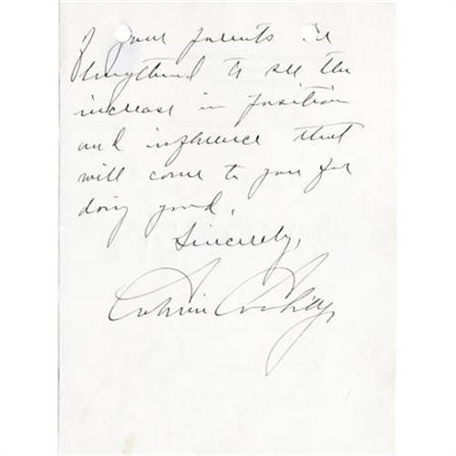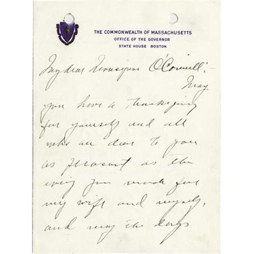 <B>Calvin Coolidge Autograph Letter Signed </B></I> "<I>Calvin Coolidge</B></I>"<I>. </B></I>Two Pages, 5” x 6.5”, Massachusetts Office of the Governor letterhead, undated. Before his years in the White House, Calvin Coolidge (1872-1933) served as Governor of Massachusetts from January 2, 1919 to January 6, 1921. In this ALS written at the Massachusetts State House in Boston, Coolidge writes in full: <I>“My dear Monsignor O’Connell: May you have a Thanksgiving for yourself and all who are dear to you as pleasant as the evening you made for my wife and myself, and may the days of your parents be lengthened to see the increase in position and influence that will come to you for doing good. Sincerely, Calvin Coolidge”</B></I> The letter is in fine condition, with two hole punches at the top and one center fold. <I>From the collection of Henry E. Luhrs.</B></I><BR><BR><b>Shipping:</b> Flat Material, Small (<a target="_blank" href="http://www.heritageauctions.com/common/shipping.php">view shipping information</a>)