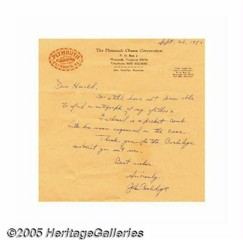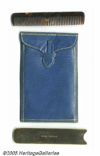 <B>Calvin Coolidge Comb in Case with Letter from John Coolidge</B></I> Calvin Coolidge was a man of few words, and he always appeared in public immaculately groomed and polished (with the possible exception of his photo in an Indian Headdress on the White House lawn one day). Coolidge's son, John Coolidge, gave this unique pocket comb, engraved with his father's name, and case to an admirer around twenty years ago. A handwritten letter on Plymouth Cheese Corporation letterhead from the Coolidge son accompanies this very personal and historic presidential item. Lot:254