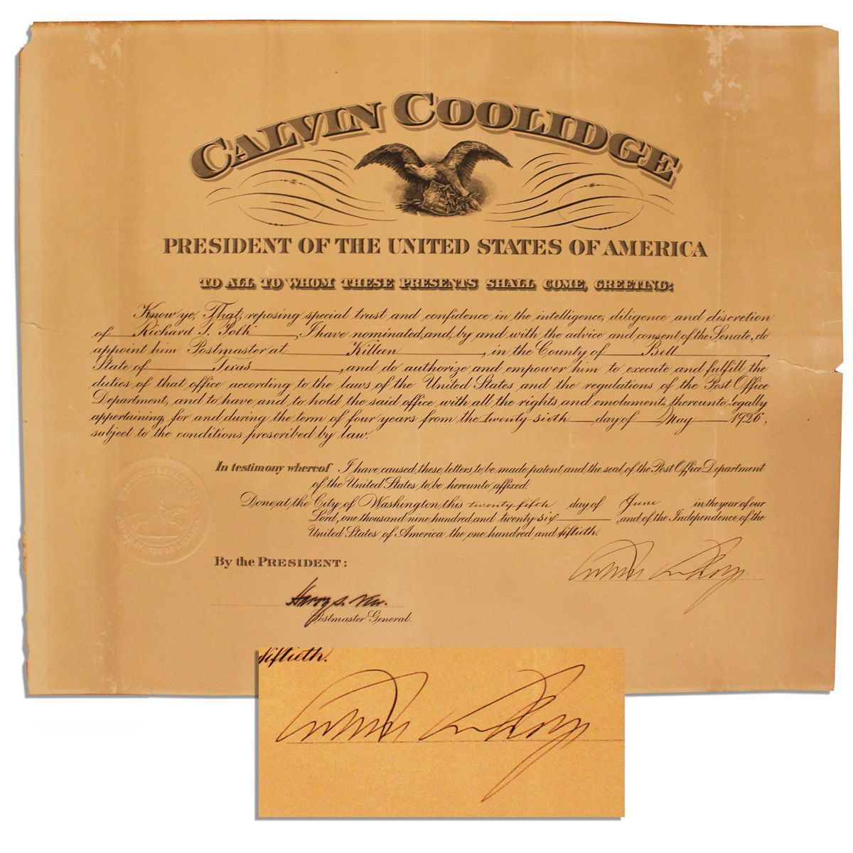 25 June 1926 postmaster appointment signed by President Calvin Coolidge. The document appoints Richard T. Polk to the office of postmaster in Killeen, Texas. Partly printed document bears the President's name at top, above an engraved eagle, and has an embossed postal service seal at lower left. Measures 17'' x 14''. One 3'' tear at right center margin, some chipping to edges and toning. In good condition.