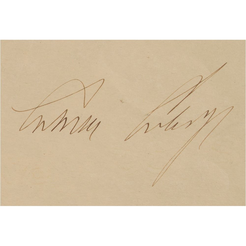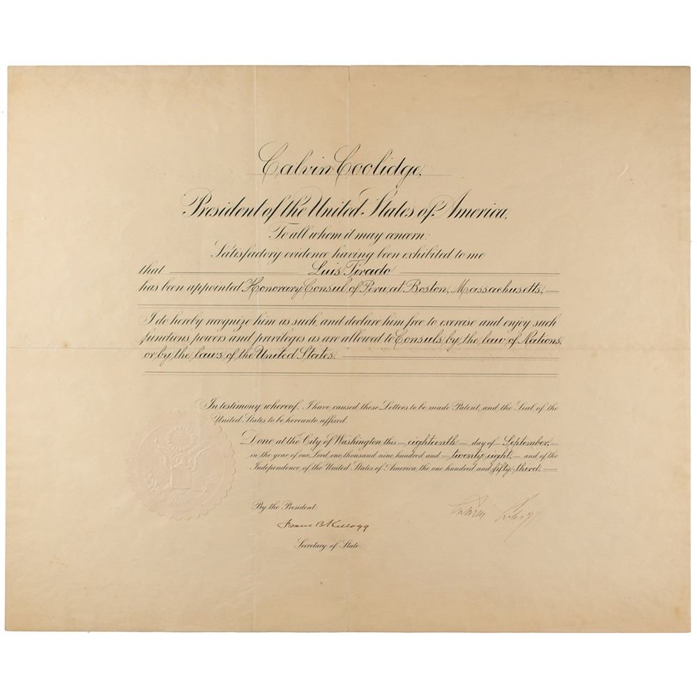 Partly-printed DS as president, one page, 23 x 19, September 18, 1928. President Coolidge recognizes the appointment of Luis Tirado as "Honorary Consul of Peru at Boston, Massachusetts." Signed at the conclusion by President Coolidge and countersigned by Secretary of State Frank B. Kellogg. The white paper seal affixed to the lower left remains intact. In very good to fine condition, with light show-through from small pieces of old tape along the back edges.