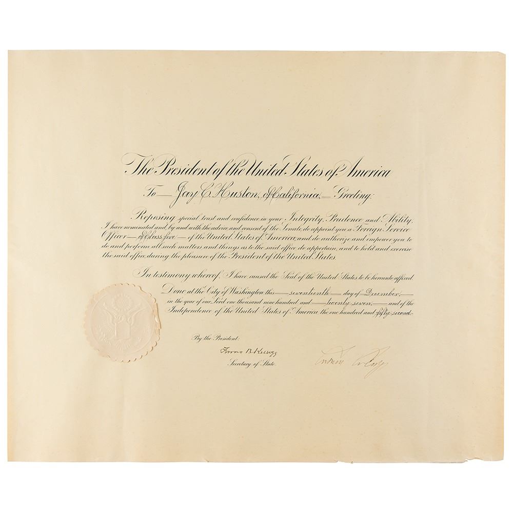 Partly-printed DS as president, one page, 23 x 19, December 17, 1927. President Coolidge appoints Jay C. Huston of California as "a Foreign Service Officer of Class five." Signed at the conclusion in ink by President Coolidge and countersigned by Secretary of State Frank B. Kellogg. The embossed paper seal affixed to the lower left remains intact with a bit of edge creasing. Tightly rolled and in very good to fine condition, with edgewear and light soiling.