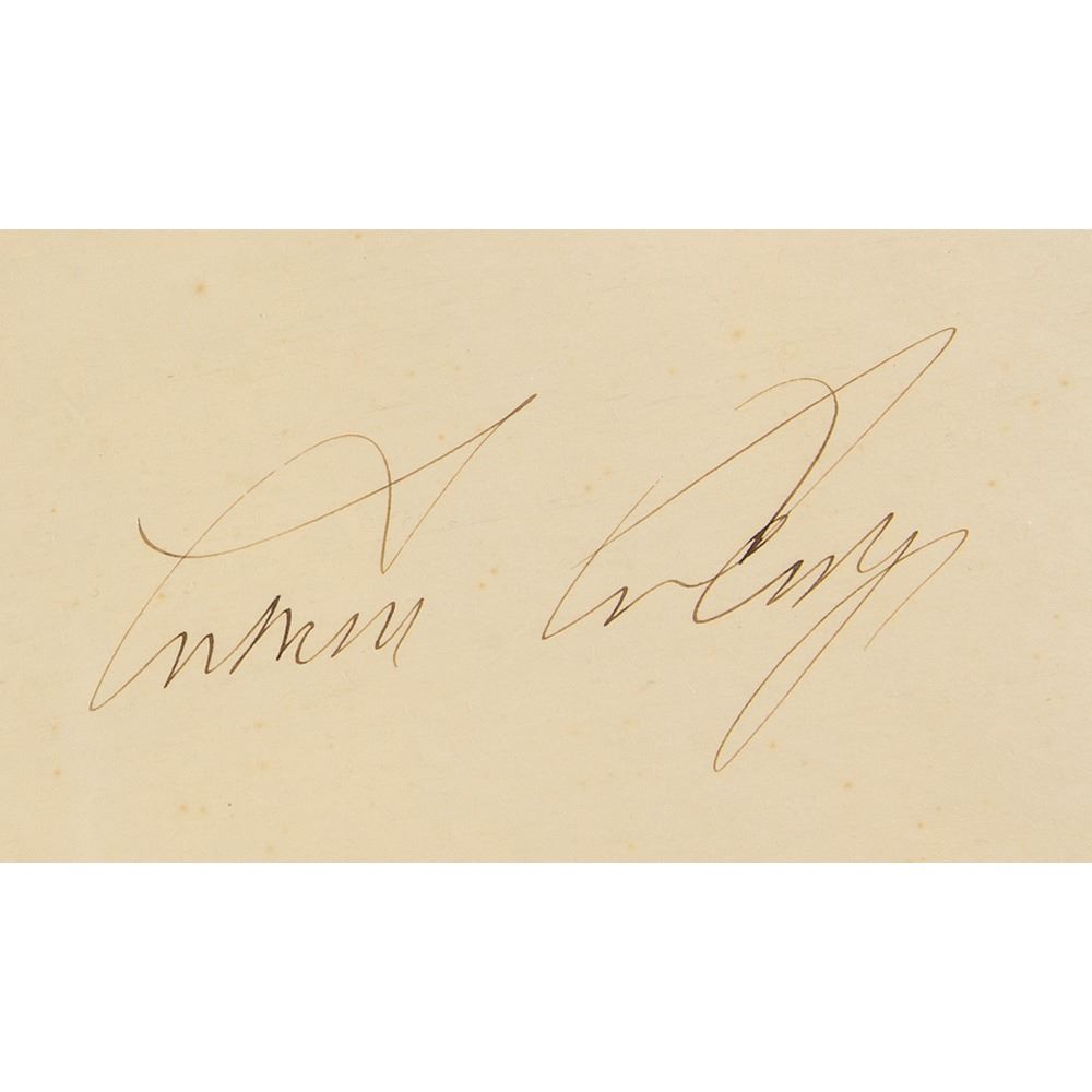 All lots sold by RR Auction are accompanied by an Auction Certificate ("AC”). On any lot presented with an AC issued by RR Auction, the certification is only as to its attribution to the person or entity described or to the lot's usage and only as explicitly stated therein (the "Certification of Authenticity”), to the exclusion of any other warranties, express or implied, including but not limited to those pursuant to the Uniform Commercial Code. The Certification of Authenticity inures only to the original Bidder (as shown in RR Auction's records). Bidder may not transfer, assign, or otherwise convey the Certification of Authenticity, and such purported transfer, assignment, or conveyance shall be null and void. The Certification of Authenticity is valid from date of the Auction in which Bidder was awarded the lot (the "Auction Date”) until five (5) years after the Auction Date, without exception.
