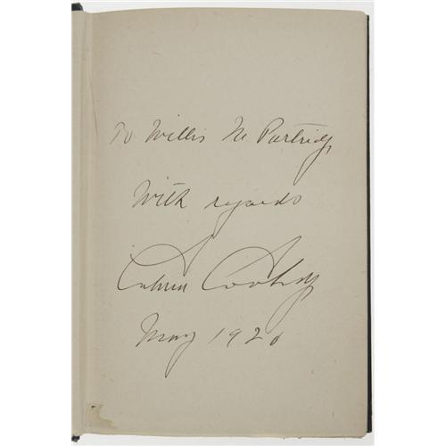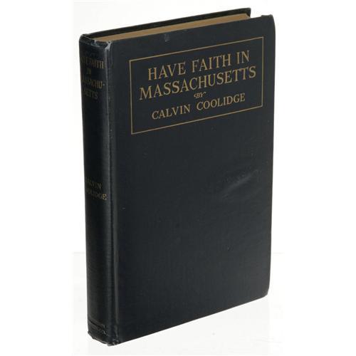 <B>Calvin Coolidge Inscribed Book: <I>Have Faith in Massachusetts</B></I></B></I> (Boston: Houghton Mifflin Co., 1919), second edition, 275 pages, 12mo (5.25" x 7.75"), dark blue cloth, inscribed on front free endpaper, "<I>To Willis N Partridge With regards Calvin Coolidge May 1920</B></I>". A collection of Coolidge's writings published while he was Governor of Massachusetts. Wear to cover edges as expected; a 1" x 2" area of blistering on the front cover. Overall very good condition with a large signature of the man who would become the nation's 30th president. <BR><BR><B>Important notice:</