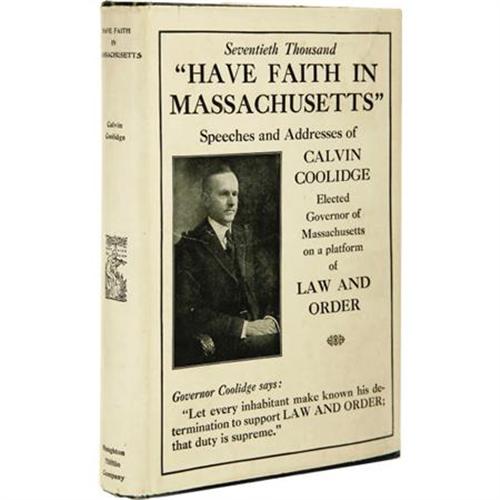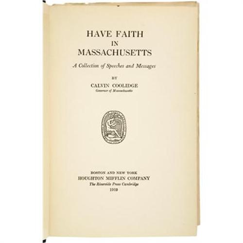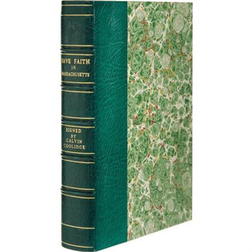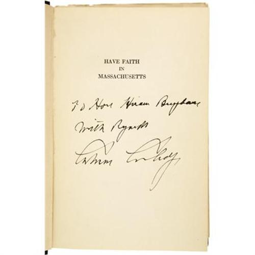 <B>Calvin Coolidge: Signed First Edition of <I>Have Faith in Massachusetts:</B></I></B></I> <I>A Collection of Speeches and Messages.</B></I> (Boston and New York: Houghton Mifflin Company, 1919), first edition, 224 pages, dark blue cloth with gilt lettering on the spine and the front board, 12mo (5.25" x 7.75"), dust jacket (in protective Mylar). Inscribed and signed "<I>To Hon. Hiram Bingham With Regards Calvin Coolidge</B></I>" on the front free endpaper. During his time as a lecturer and professor at Yale, Hiram Bingham reintroduced to the world the once lost Incan city of Machu Picchu. He was also later elected governor of Connecticut (for one day) and elected as a United States Senator from Connecticut after the suicide of Frank Bosworth Brandegee (his victory in the Senate race is the reason he served only one day as governor). Later, Coolidge would appoint Bingham to the Aircraft Board, earning the first-term senator the nickname "The Flying Senator." The book is in very good condition, with minor edge wear and lightly bumped corners. The inner text has a few scattered pencil marks in the margins, but is overall very clean. The dust jacket is in very good condition, with edge wear and some professional restoration, including a 1.75" tear at the spine fold repaired with archival tape. The book is housed in a sturdy custom quarter leather slipcase with gilt spine lettering, five raised spine bands, and marbled boards. A wonderful signed compendium of Coolidge's public addresses while he was still governor of Massachusetts.<BR><BR><b>Shipping:</b> Books & Catalogs (<a target="_blank" href="http://www.heritageauctions.com/common/shipping.php">view shipping information</a>)