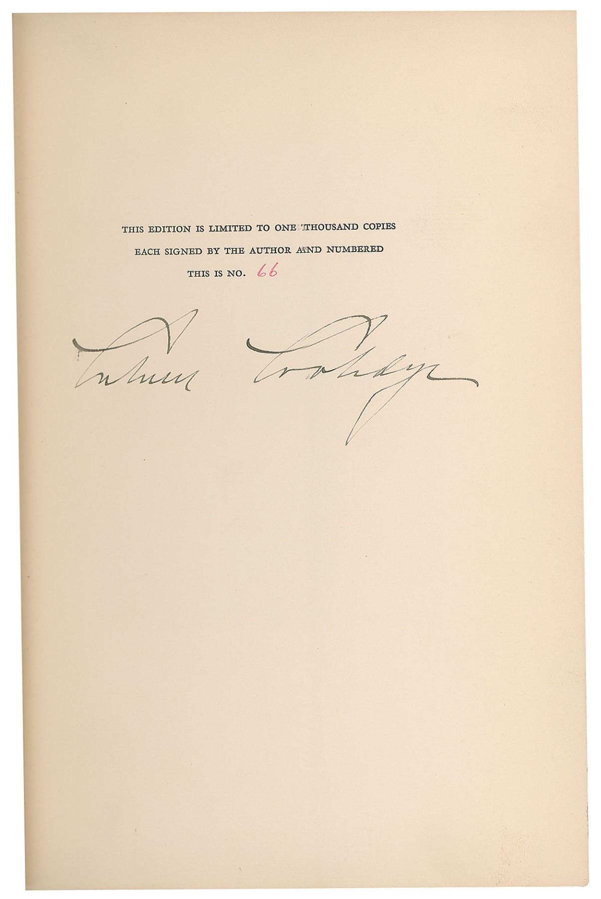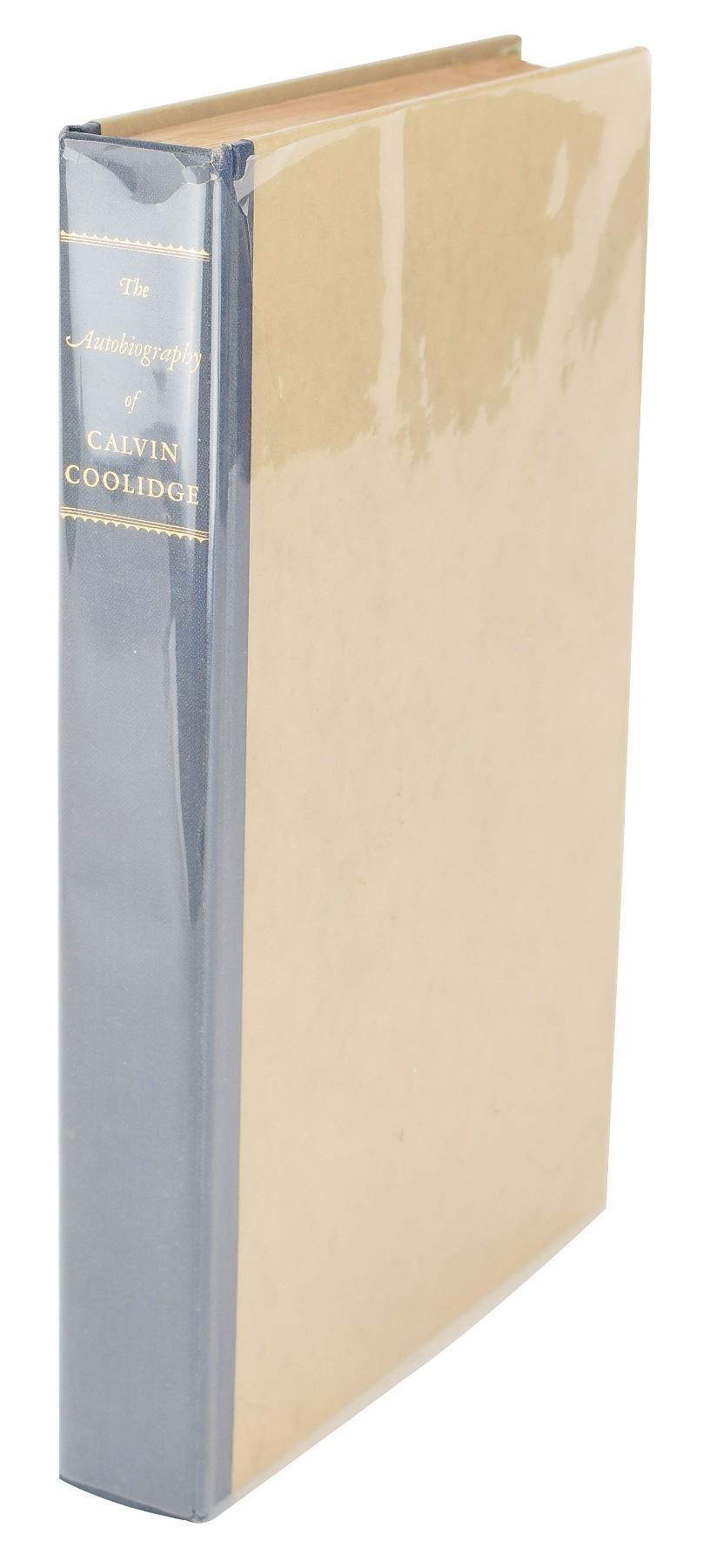Signed book: The Autobiography of Calvin Coolidge. First edition, limited issue, numbered 66/1000. NY: Cosmopolitan Book Corporation, 1929. Hardcover with gilt spine lettering, 6.5 x 9.5, 247 pages. Signed on the colophon in fountain pen, "Calvin Coolidge." Autographic condition: very fine. Book condition: NF/None, with a "Philip Greely Brown" bookplate affixed to the front pastedown, and a "Library of Lawrence E. Miller" blindstamp to a rear page.