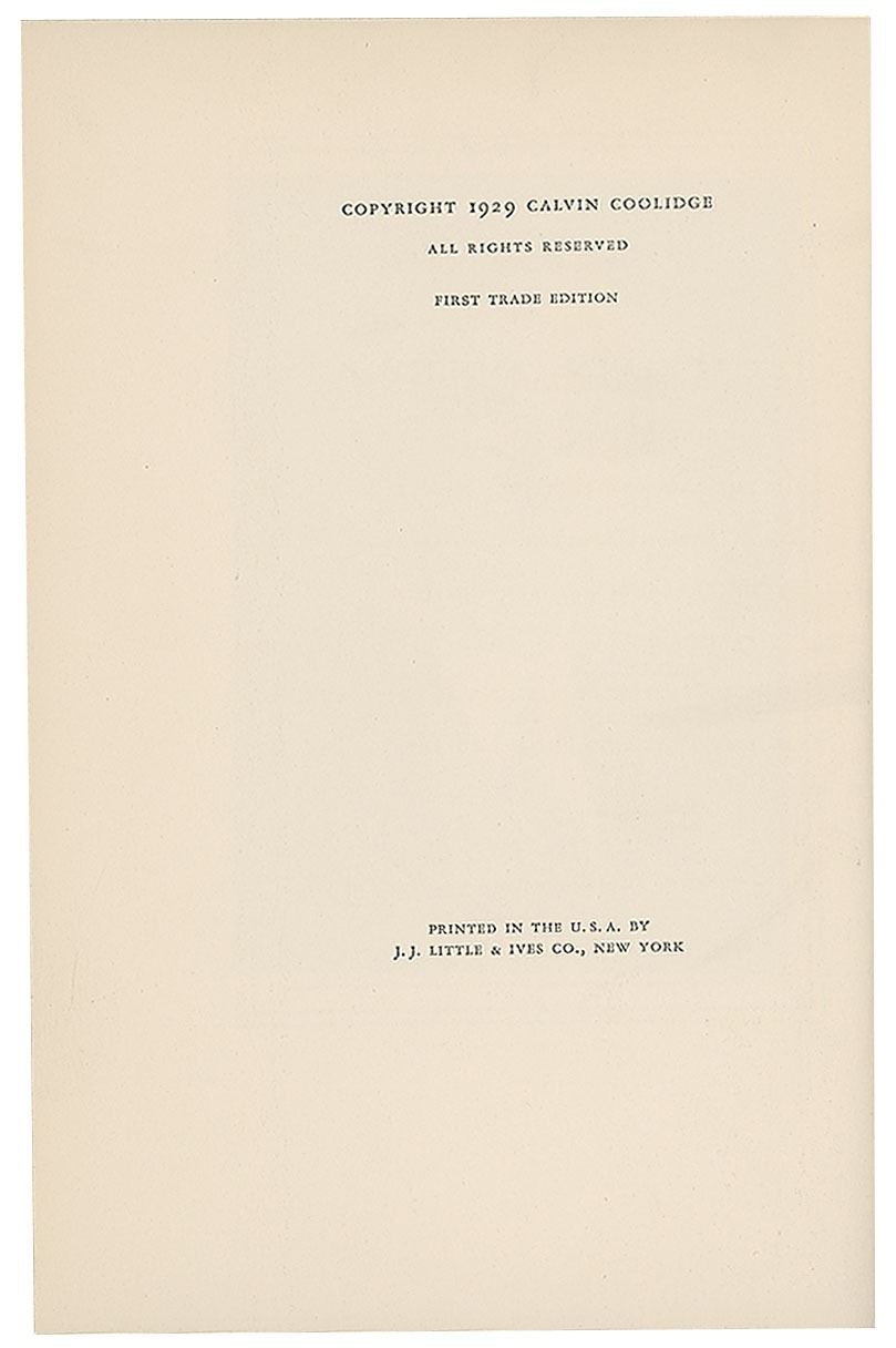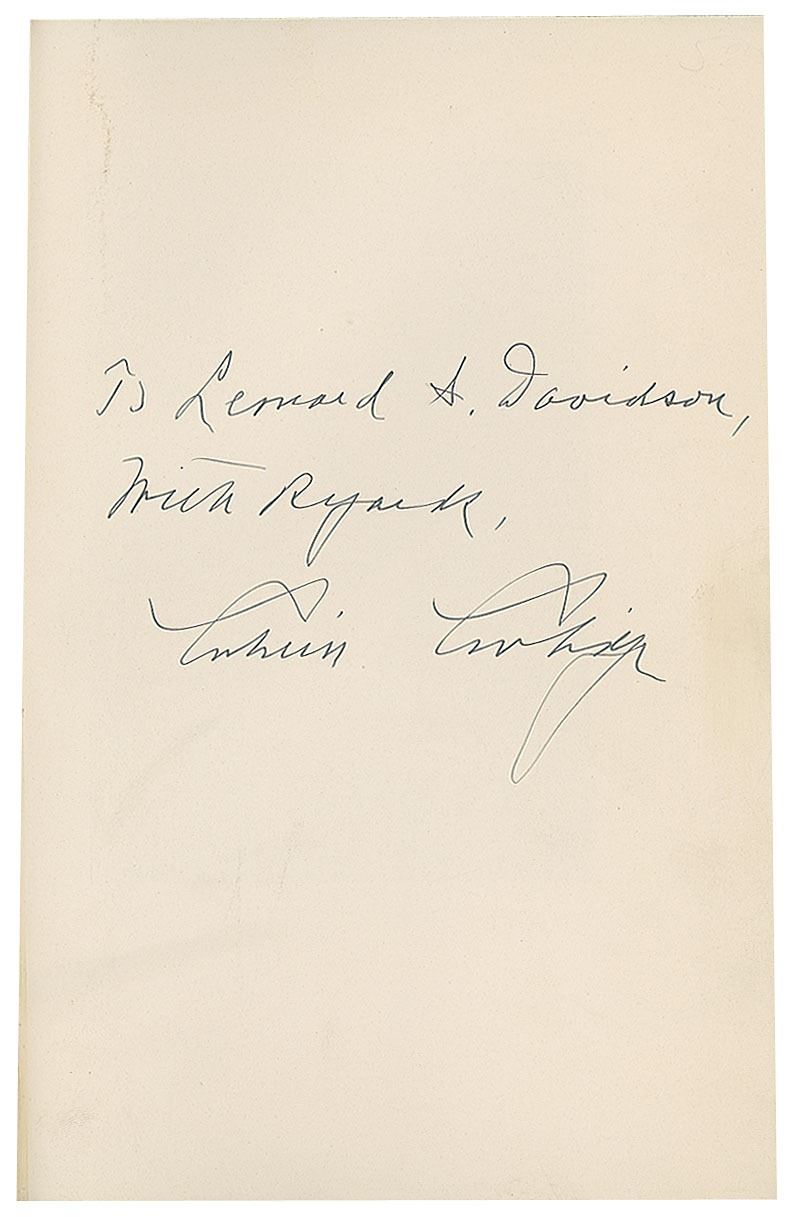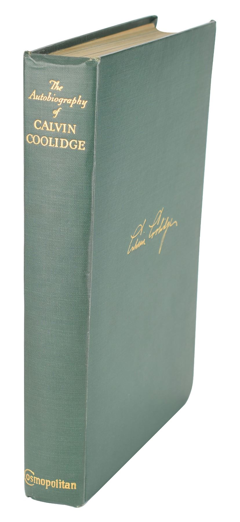 Signed book: The Autobiography of Calvin Coolidge. First trade edition. NY: The Cosmopolitan Book Corporation, 1929. Hardcover bound in green cloth with gilt stamping , 6 x 8.75, 247 pages. Signed and inscribed on a free end page in ink, "To Leonard A. Davidson, With Regards, Calvin Coolidge." Autographic condition: fine. Book condition: VG+/None.