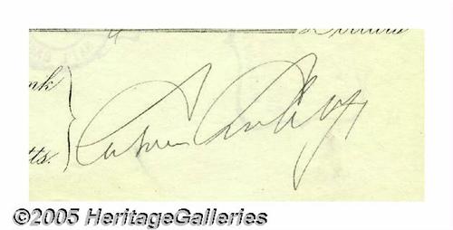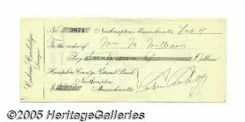 <B>Calvin Coolidge Signed Check</B></I> This check signed by future president Calvin Coolidge was drawn on the account of "Calvin Coolidge Lawyer" in the Hampshire County National Bank of Northampton, Massachusetts, February 4, 1918. Coolidge's signature is clean and bold, unaffected by the cancellations. Lot:263