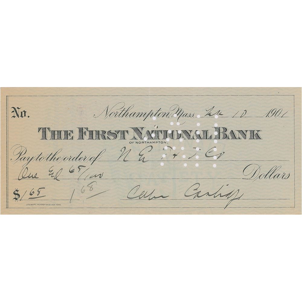 The First National Bank check, 6.5 x 3, filled out and signed by Calvin Coolidge, payable to N. E. T. & T. Co. for $1.68, February 10, 1901. In fine condition, with faint toning to the left side.