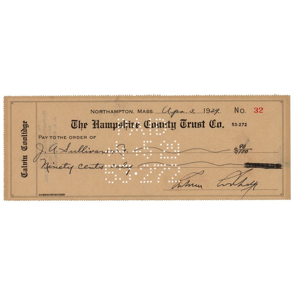 Personal check, 8.25 x 3, filled out in another hand and signed by Coolidge, "Calvin Coolidge," payable to J. A. Sullivan Co. for $90, April 3, 1929. In fine condition. Coolidge had left the presidency one month earlier, retiring to a modest house in Northampton, Massachusetts.