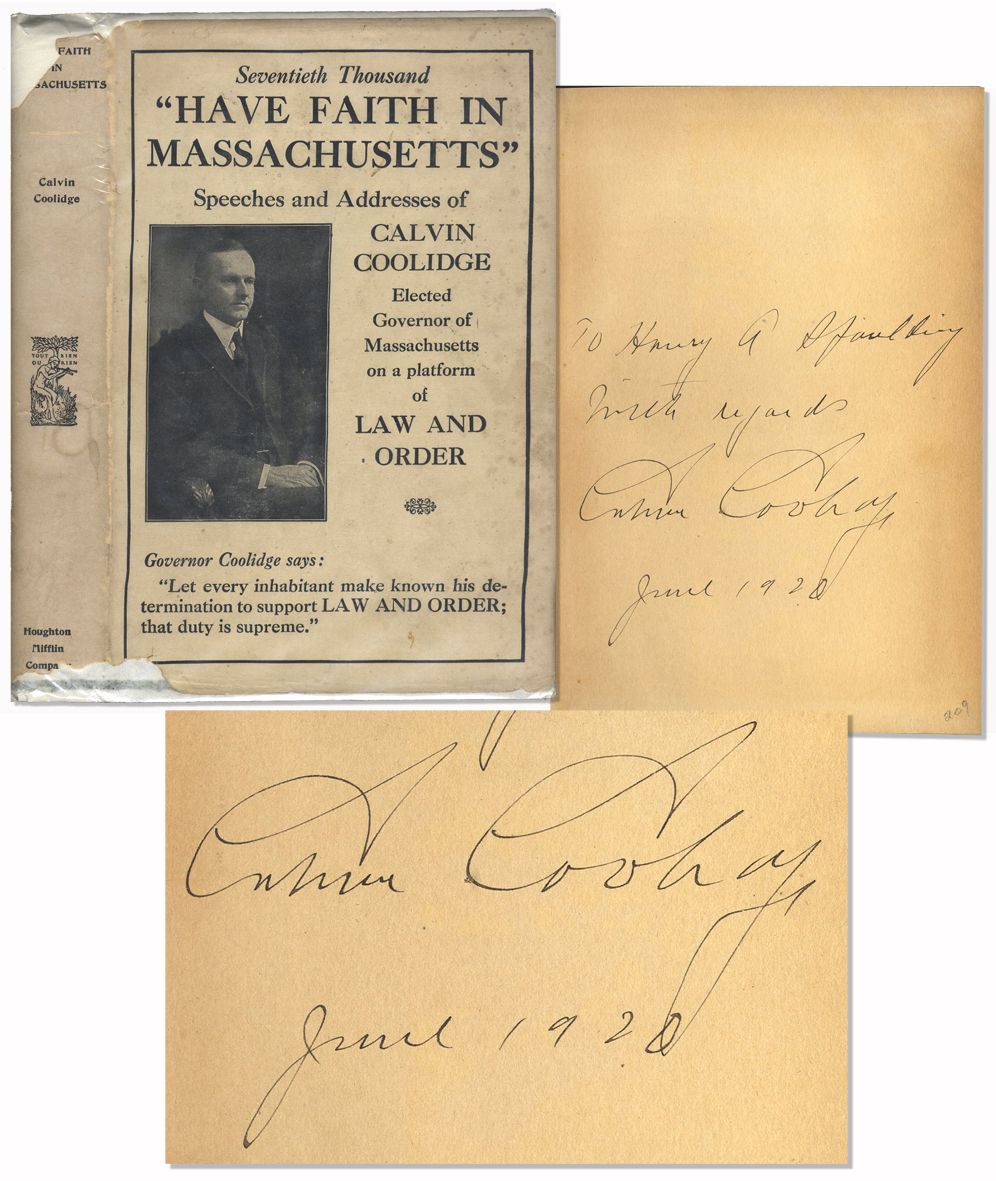 Calvin Coolidge signed second edition of his book ''Have Faith in Massachusetts''. Boston and New York: Houghton Mifflin Company: 1919. Collection of some of Coolidge's most memorable speeches and opinions on the New England state. A year after its publication, Coolidge went on to become Vice President in 1920 and in 1923, became President after Warren Harding's unexpected death. Book is inscribed: ''To Henry A. Spaulding / With regards / Calvin Coolidge / June 1920''. Book runs 275pp., bound in blue cloth boards with gilt text stamping. Light wear and toning to pages. Dustjacket is intact, though chipping along edges. Very good condition.