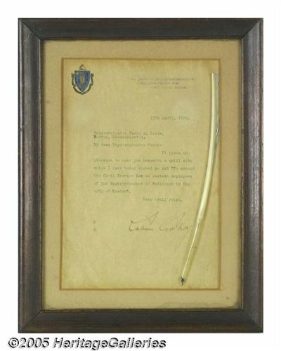 <B>Calvin Coolidge Signed Letter and Bill-signing Quill Pen</B></I> Dated April 15, on Commonwealth of Massachusetts letterhead (as Governor). <I>"My dear Representative Goode: It gives me great pleasure to hand you herewith a quill with which I have today signed an Act 'To extend the Civil Service Law....'"</B></I> Overall moderate age browning; still mounted together in original frame. Unusual! 10.5" x 13" as framed. Lot:263