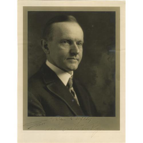 <B>Calvin Coolidge Signed Photograph</B></I> by Garo, 9.5" x 12.5" overall with an image size of 7.5" x 9.25". Signed, inscribed, and dated 1923 by Coolidge in the lower area in ink and also signed in pencil "<I>Garo</B></I>" by the photographer John Garo, the Armenian-born, Boston-based studio-portrait photographer who played a part in the early training of Josef Karsh. Of some small irony, the man who presided over America during its most flamboyant era, "The Roaring Twenties," was known as "Silent Cal." While the newspapers were filled on a daily basis with the exploits of Lindbergh, Ruth, Dempsey, Earhart, and Capone, Calvin Coolidge quietly went about the business of running the country. Unfortunately, his relatively passive approach let the excesses build to the point where his successor Herbert Hoover would inherit an economy approaching meltdown. Fine condition save for a bit of silvering and a couple of edge creases.<BR><BR><b>Shipping:</b> Flat Material, Small (<a target="_blank" href="http://www.heritageauctions.com/common/shipping.php">view shipping information</a>)