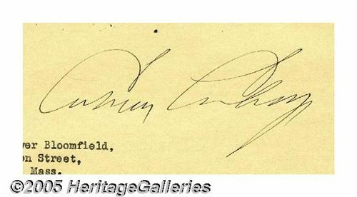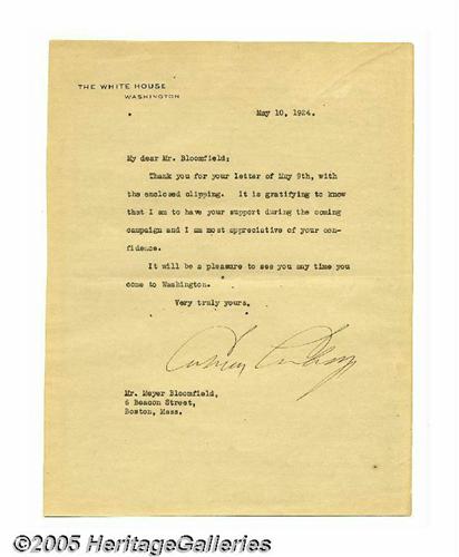 <B>Calvin Coolidge TLS as President</B></I> Typed letter signed by Calvin Coolidge on letterhead of "The White House," May 10, 1924, to Meyer Bloomfield of Boston. In it President Coolidge thanks Bloomfield for <I>"...your support during the coming campaign..."</B></I> and states, <I>"It will be a pleasure to see you any time you come to Washington."</B></I> This example of a presidential TLS is very clean. Lot:263