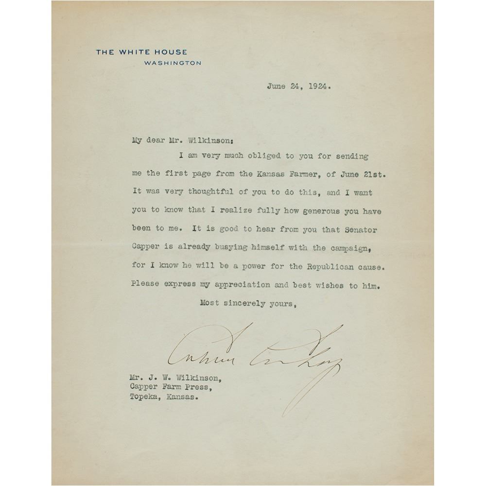 TLS as president, one page, 7 x 8.75, White House letterhead, June 24, 1924. Letter to J. W. Wilkinson, in part: "I am very much obliged to you for sending me the first page from the Kansas Farmer, of June 21st. It was very thoughtful of you to do this, and I want you to know that I realize fully how generous you have been to me. It is good to hear from you that Senator Capper is already busying himself with the campaign, for I know he will be a power for the Republican cause." Mounted, matted, and framed to an overall size of 13.5 x 16. In fine condition, with faint edge toning.