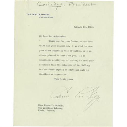 <B>Calvin Coolidge Typed Letter Signed as President</B></I> “<I>Calvin Coolidge</B></I>”. One page, 7” x 9”, on White House letterhead, Washington, January 30, 1925, to Ambassador Myron T. Herrick, Paris, France. President Coolidge writes in part: “Thank you for your letter of the 16th which has just reached me…I am glad to have your views regarding this situation…It is especially gratifying, of course, to have your assurance that the selection of Mr. Kellogg for the Secretaryship of State has made an excellent impression.” With the usual fold creases, evidence of a paperclip at the top left corner, a penciled notation from a former collector at the top, else near fine. <I>Ex. Henry E. Luhrs Collection</B></I>.<BR><BR><BR><b>Shipping:</b> Flat Material, Small (<a target="_blank" href="http://www.heritageauctions.com/common/shipping.php">view shipping information</a>)