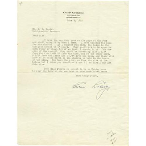 <B>Calvin Coolidge Typed Letter Signed</B></I> “<I>Calvin Coolidge</B></I>”. One page, 8.5” x 11”, on Coolidge's personal letterhead, Northampton Massachusetts , June 6, 1932, to Mr. H. V. Woods, Bridgewater, Vermont. Presumably a letter to the caretaker of Coolidge's family home in Plymouth Notch, Vermont regarding some work being done on the house. Of particular note is the last sentence of the letter which reads: “<I>Tell Miss Pierce we expect to be up Friday noon to stay one day, so she can have us some more baked beans.</B></I>” An interesting letter written from Coolidge's Northampton, Massachusetts home “The Beeches” in the last year before his death. Fine condition. <I>From the collection of Henry E. Luhrs.</B></I><BR><BR><b>Shipping:</b> Flat Material, Small (<a target="_blank" href="http://www.heritageauctions.com/common/shipping.php">view shipping information</a>)