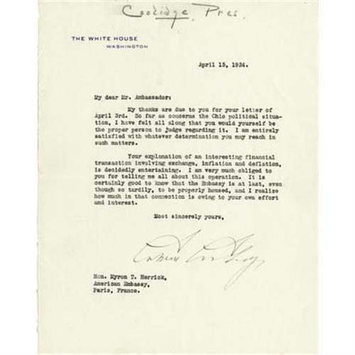 <B>Calvin Coolidge Typed Letter Signed</B></I>. The 30th President of the United States writes to the Hon. Myron T. Herrick at the American Embassy in Paris, one page, 7” x 8.75”, White House letterhead, April 15, 1924. In full: <I>“My dear Mr. Ambassador: My thanks are due to you for your letter of April 3rd. So far as concerns the Ohio political situation, I have felt all along that you would yourself be the proper person to judge regarding it. I am entirely satisfied with whatever determination you may reach in such matters. Your explanation of an interesting financial transaction involving exchange, inflation and deflation, is decidedly entertaining. I am very much obliged to you for telling me all about this operation. It is certainly good to know that the Embassy is at last, even though so tardily, to be properly housed, and I realize how much in that connection is owing to your own effort and interest. Most sincerely yours, Calvin Coolidge” </B></I>“Coolidge Pres.” is written in pencil at the top of the page. The letter is in fine condition with one center fold and some roughness on the left border. <I>From the collection of Henry E. Luhrs.</B></I><BR><BR><b>Shipping:</b> Flat Material, Small (<a target="_blank" href="http://www.heritageauctions.com/common/shipping.php">view shipping information</a>)