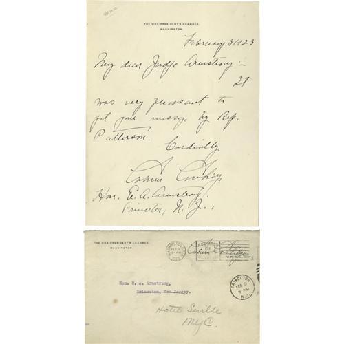 <B>Calvin Coolidge Uncommon Autograph Letter Signed as Vice President</B></I> Autograph Letter Signed, <I>as Vice President,</B></I> 1 page, on the embossed letterhead of The Vice President's Chamber, Washington, February 3, 1923. To Judge E. A. Armstrong in Princeton. In Fine condition, with a huge signature. Accompanied by the transmittal envelope bearing Coolidge's printed free frank. In full: "<I>It was very pleasant to get your message by Rep. Patterson. Cordially...</B></I>" From the Henry E. Luhrs Collection. Accompanied by LOA from PSA/DNA.