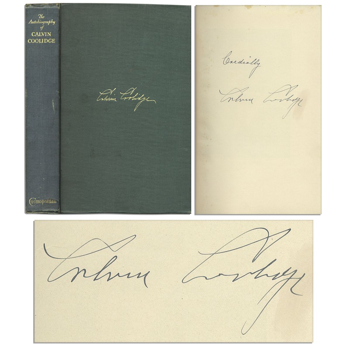 Signed copy of ''The Autobiography of Calvin Coolidge'', second trade edition, published by Cosmopolitan Book Corporation: New York: 1929. The president inscribes the fly-leaf, ''Cordially / Calvin Coolidge'' in blue ink. Autobiography covers Coolidge's life from his idyllic upbringing in Vermont through the end of his Presidency. Accompanied by a pamphlet titled, ''Calvin Coolidge writes a book review'', a full printed page of Coolidge's recommendation for the book ''Daniel Webster'' by Allan Benson. Autobiography runs 247pp. Bound in forest green cloth boards with gilt lettering. Measures 6'' x 9''. Cracking to interior hinges, very slight cocking to spine and light soiling to boards, else near fine.