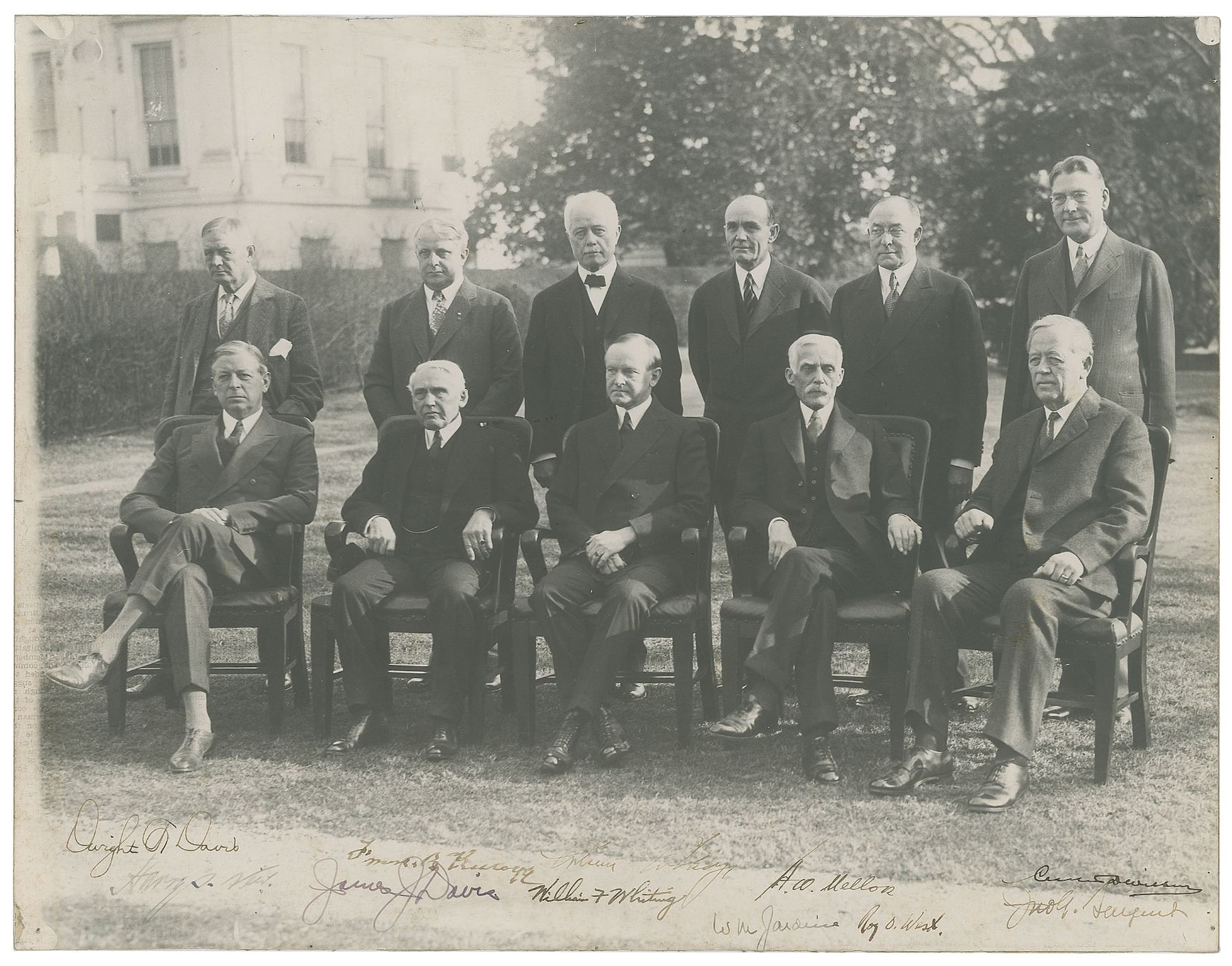 Impressive vintage matte-finish 14 x 11 photo of President Coolidge and his cabinet on the White House lawn, signed in fountain pen by all pictured: President Calvin Coolidge, Secretary of State Frank B. Kellogg, Secretary of the Treasury Andrew W. Mellon, Secretary of War Dwight F. Davis, Attorney General John G. Sargent, Postmaster General Harry S. New, Secretary of the Navy Curtis D. Wilbur, Secretary of the Interior Roy O. West, Secretary of Agriculture William M. Jardine, Secretary of Commerce William F. Whiting, and Secretary of Labor James J. Davis. Affixed to a same-size mat and in fine condition, with Coolidge's signature quite light and some offsetting from newsprint along the left edge.