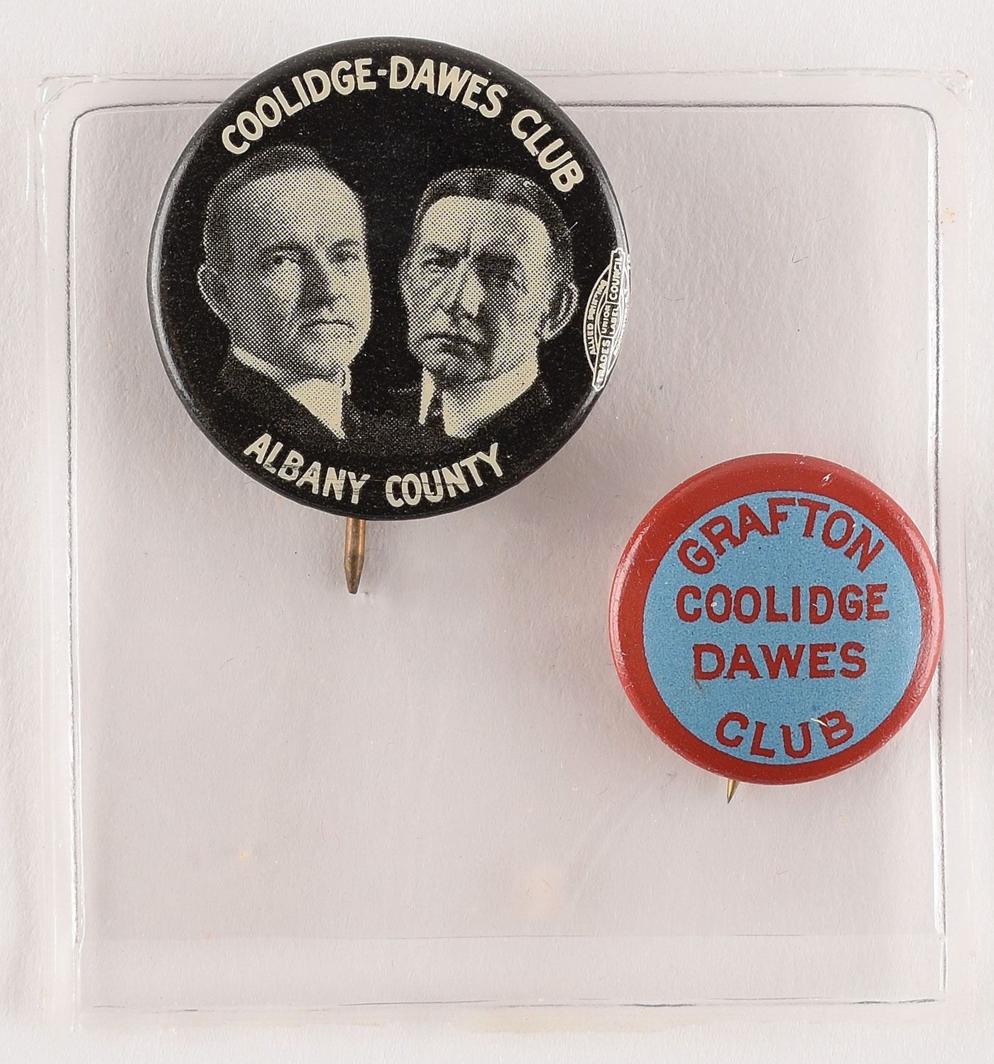 Two "Coolidge Dawes Club" pins from their 1924 campaign: a blue-and-red 3/4? "Grafton Coolidge Dawes Club" pinback button; and a scarce 1? "Coolidge-Dawes Club, Albany County" jugate pinback button with portraits of the Republican running mates. In overall fine condition.