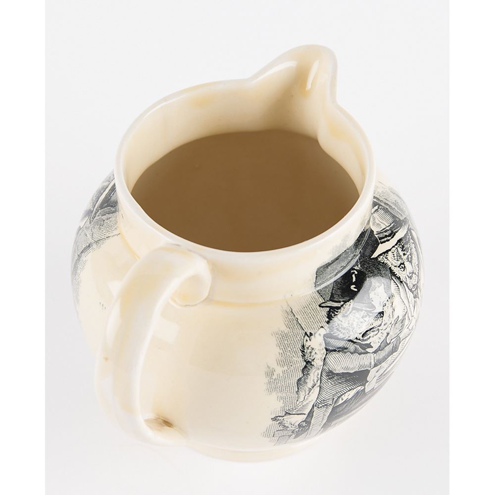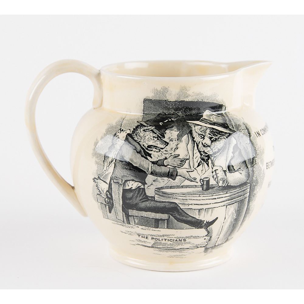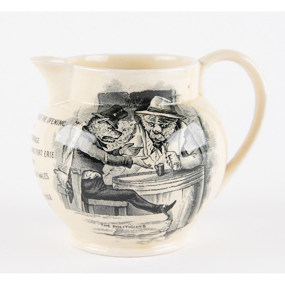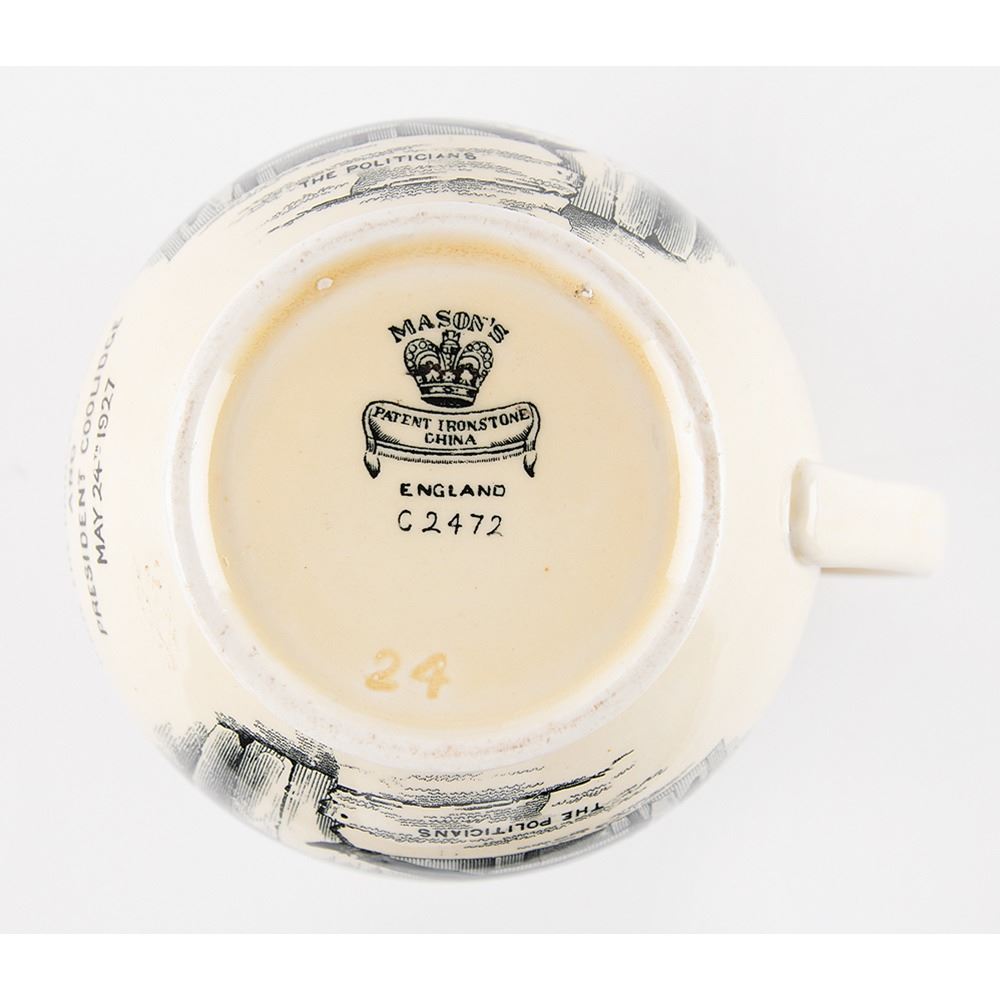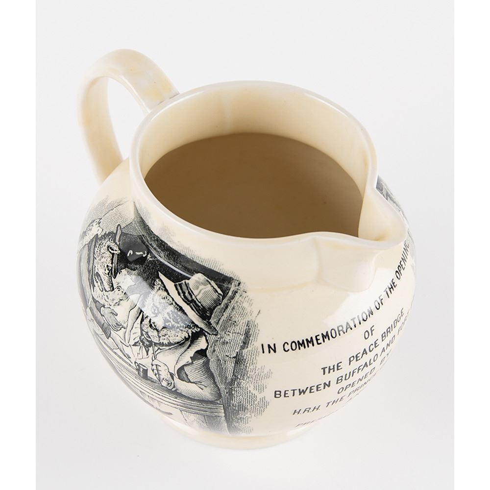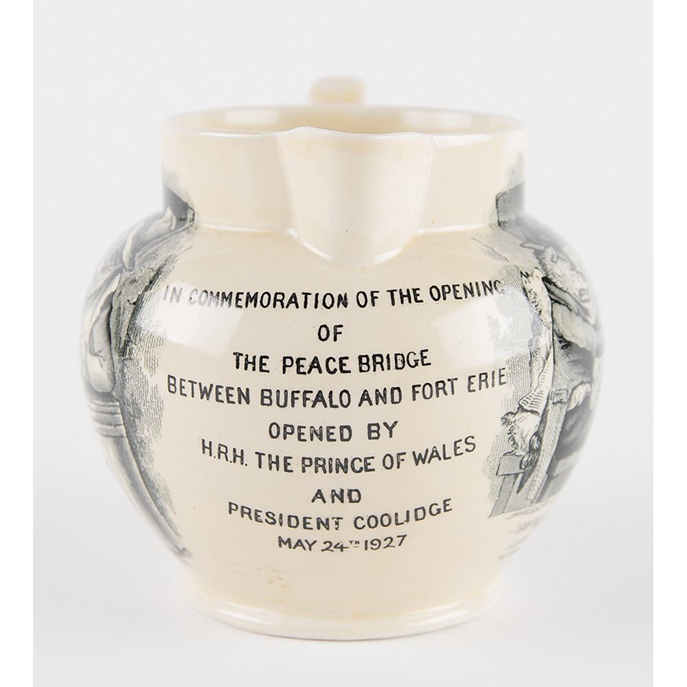 Rare Mason's Pottery pitcher commemorating the 1927 opening of the Peace Bridge, which connects Buffalo, New York, in the United States to Fort Erie, Ontario, in Canada. The 5Ë tall pitcher features satirical transfer prints/illustrations of "The Politicians," with text reading: “In Commemoration of the Opening of the Peace Bridge Between Buffalo and Fort Erie Opened By H.R.H. The Prince of Wales and President Coolidge May 24th 1927.†Features maker's marks and serial number on the bottom: "Mason’s / Patent Ironstone China / England / C2472." In very fine condition.