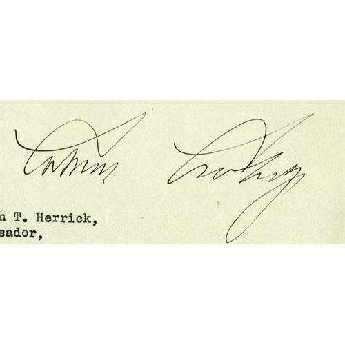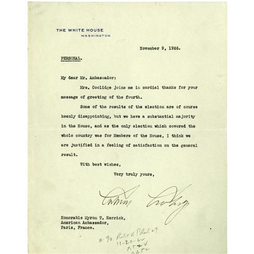 <B>Calvin Coolidge, as President, Comments on the 1926 Congressional Elections.</B></I> Typed Letter Signed, <I>as president,</B></I> 1 page, 7" by 9", marked "Personal", The White House, Washington, November 9, 1926. To the American Ambassador to France, Myron T. Herrick. Fine, with a faint pencilled note at bottom. The president comments frankly on the congressional elections of the preceding week: "<I>... Some of the results are of course keenly disappointing, but we have a substantial majority in the House, and as the only election which covered the whole country was for Members of the House, I think we are justified in a feeling of satisfaction on the general result.</B></I>" From the Henry E. Luhrs Collection. Accompanied by LOA from PSA/DNA.