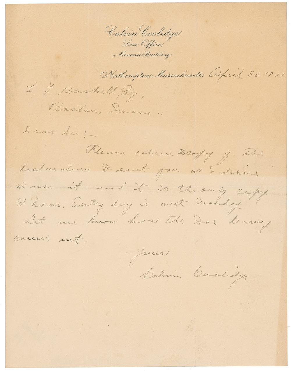 Early and uncommon ALS, one page, 8.5 x 11, Calvin Coolidge Law Office letterhead, April 30, 1902. Coolidge writes F. F. Haskell of Boston. In full: “Please return the copy of the declaration I sent you as I desire to use it and it is the only copy I have. Entry day is next Monday. Let know how the Doe hearing comes out.” In very good to fine condition, with intersecting folds, and a block of even toning to the top half of the sheet and along the lower right edge.