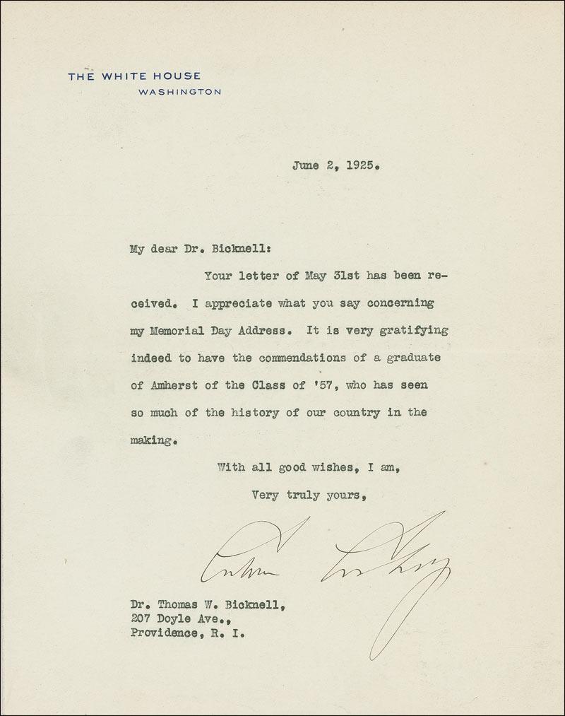 TLS as president, one page, 7 x 9, White House letterhead, June 2, 1925. President Coolidge writes Dr. Thomas Bicknell of Providence, Rhode Island. In full: “I appreciate what you say concerning my Memorial Day Address. It is very gratifying indeed to have the commendations of a graduate of Amherst of the Class of ‘57, who has seen so much of the history of our country in the making.” In fine condition, with some wrinkling, a bit of edge toning, and Coolidge’s signature a shade light.