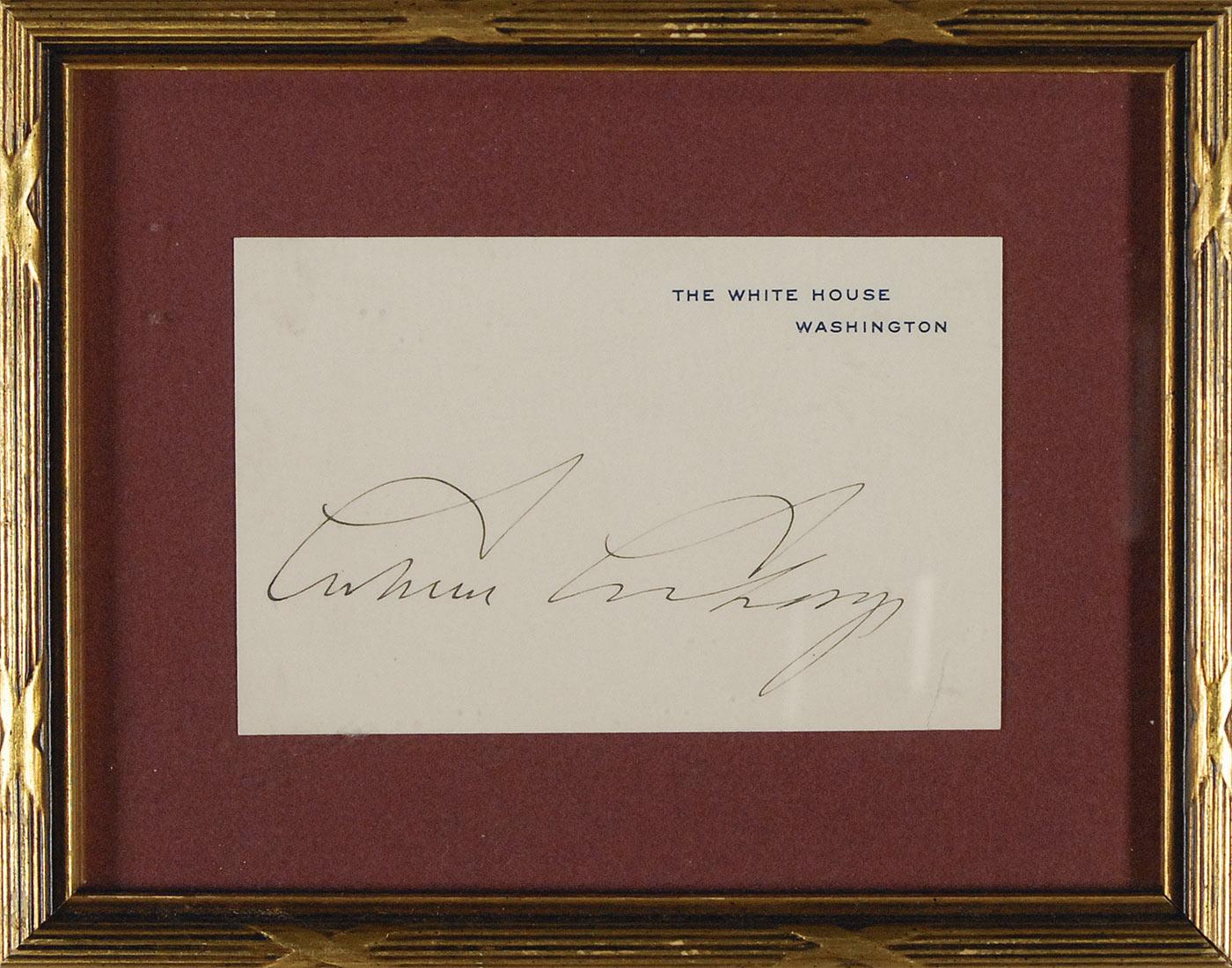 White House card signed in fountain pen “Calvin Coolidge.” Matted and framed to an overall size of 7 x 5.5. In fine condition with a touch of light soiling and a small tear to bottom right.