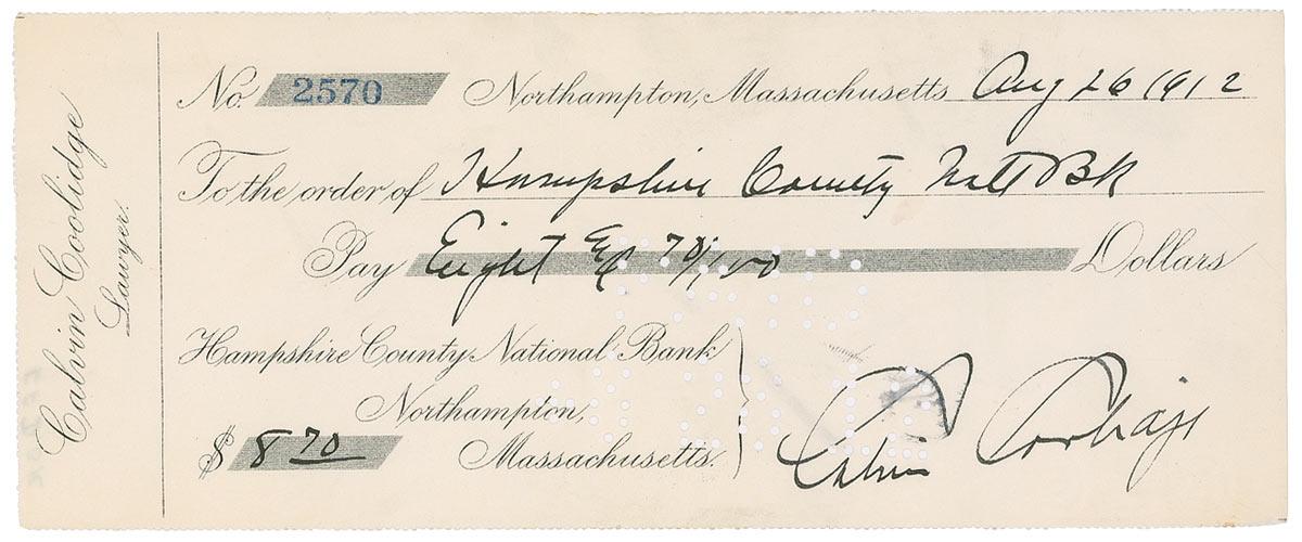 Business check, 8.25 x 3.5, filled out in another hand and signed by Coolidge, payable to Hampshire County Natl Bk for $8.70, August 26, 1912. A light vertical fold, bank cancellation holes affecting his first name, and a brush to the “C” in “Calvin,” otherwise fine condition.