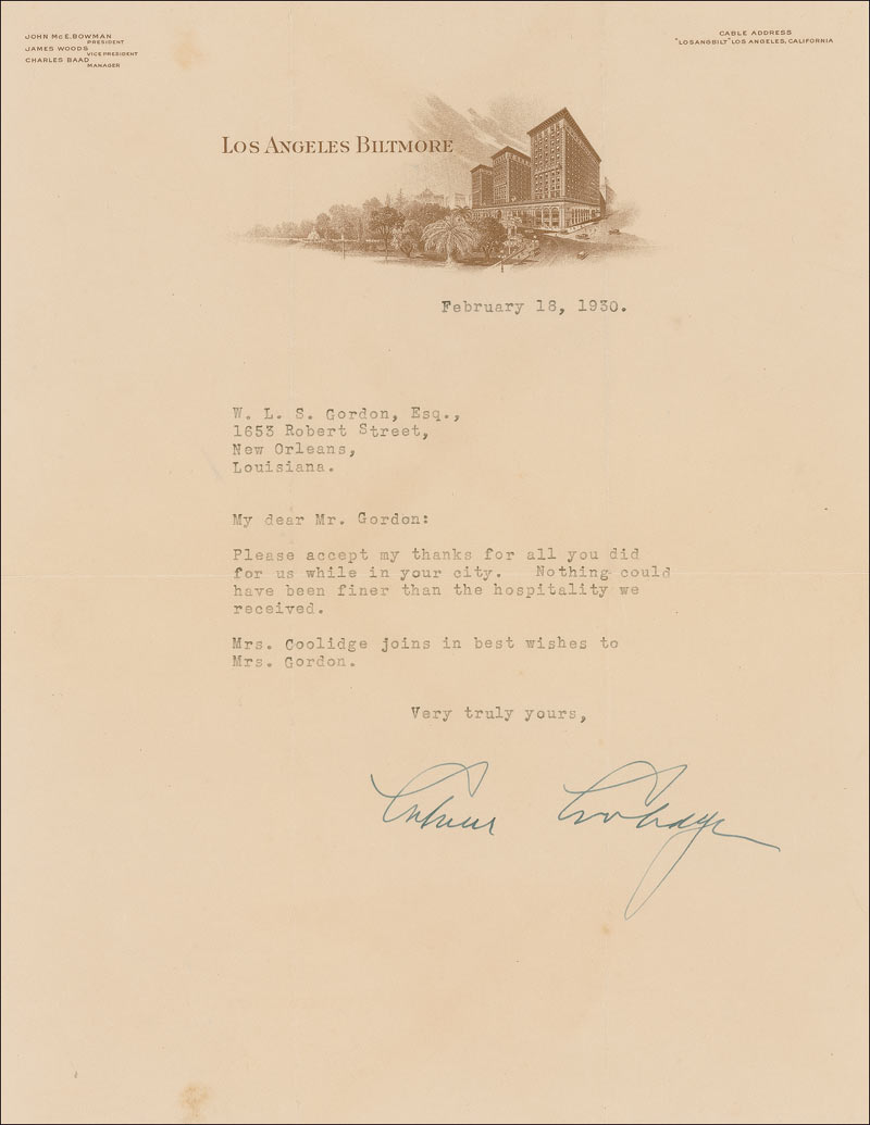 TLS, one page, 8.5 x 11, Los Angeles Biltmore letterhead, February 18, 1930. Letter of thanks to W. L. S. Gordon in New Orleans. In part: “Please accept my thanks for all you did for us while in your city. Nothing could have been finer than the hospitality we received.” In fine condition, with intersecting folds, one through a single letter of signature, a few light wrinkles, and a uniform shade of mild toning.
