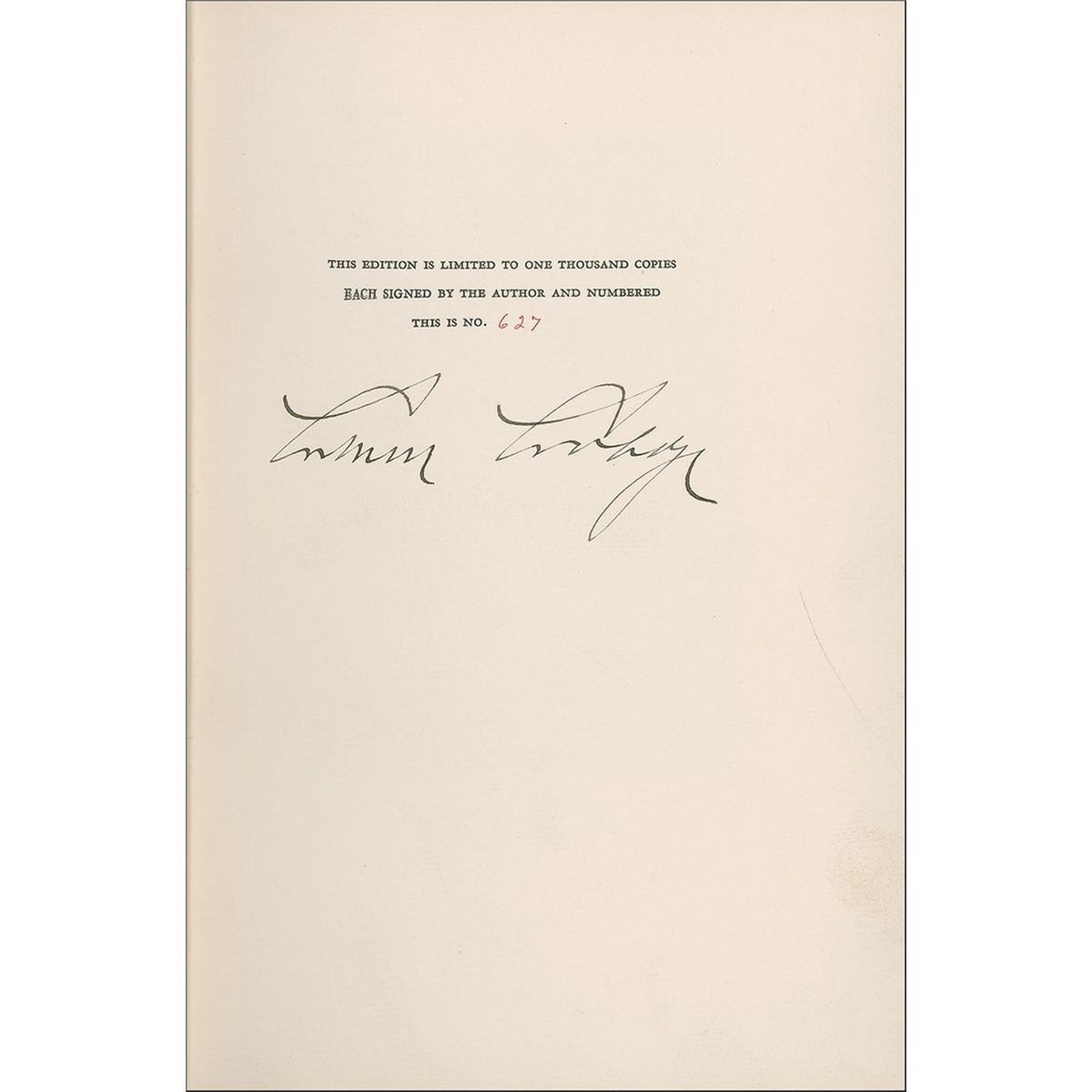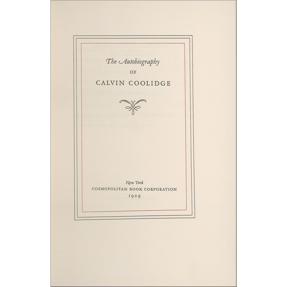Signed book: The Autobiography of Calvin Coolidge. Limited edition of 1,000 copies (this copy No. 627). NY: Cosmopolitan Book Corporation, 1929. Hardcover with slipcase, 6.25 x 9.5, 247 pages. Boldly signed in fountain pen on the limitations page. In fine condition, with a small tape remnant to back pastedown. Slipcase has scattered edge wear, light soiling, and chipping to label on spine, otherwise fine condition.