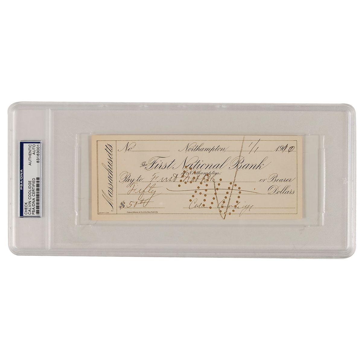 First National Bank check, 7.5 x 3, filled out in another hand and signed by Coolidge, payable to “First Nat Bk” for $50.00, January 1, 1911. Encapsulated in a plastic PSA/DNA authentication case. In very good condition, with expected cancellation holes, some affecting the first half of the last name, pencil cancellation through the signature, and a uniform shade of toning.