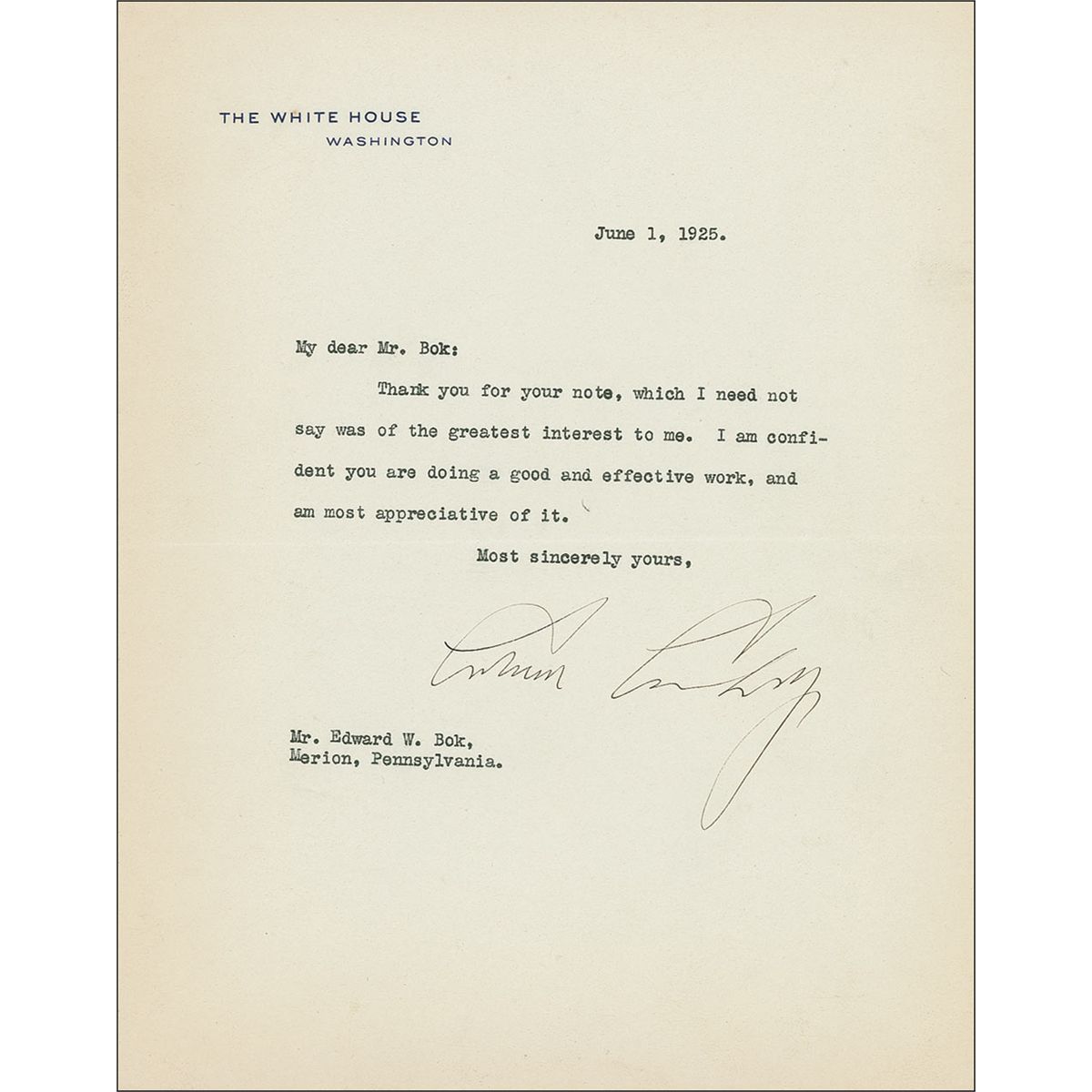 TLS as president, one page, 7 x 9, White House letterhead, June 1, 1925. Letter to Edward W. Bok. In full: “Thank you for your note, which I need not say was of the greatest interest to me. I am confident you are doing a good and effective work, and am most appreciative of it.” In fine condition, with some light toning to edges.