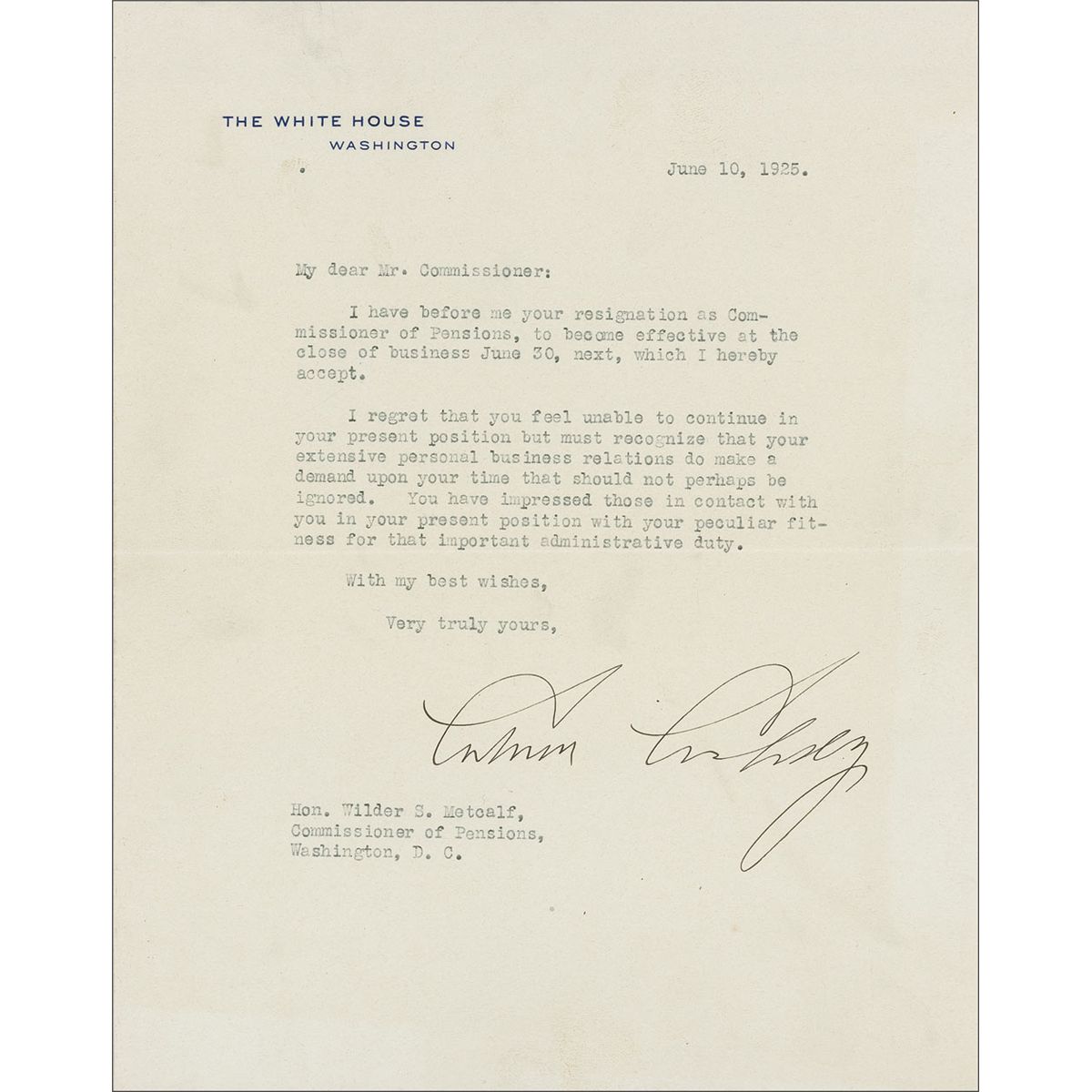 TLS as president, one page, 7 x 9, White House letterhead, June 10, 1925. Coolidge accepts the resignation of his Commissioner of Pensions. In full: “I have before me your resignation as Commissioner of Pensions, to become effective at the close of business June 30, next, which I hereby accept. I regret that you feel unable to continue in your present position but must recognize that your extensive personal business relations do make a demand upon your time that should not perhaps be ignored. You have impressed those in contact with you in your present position with your peculiar fitness for that important administrative duty.” Mild uniform toning from previous display, a bit of light soiling, and a few bends and creases, otherwise fine condition. Accompanied by the original transmittal envelope.