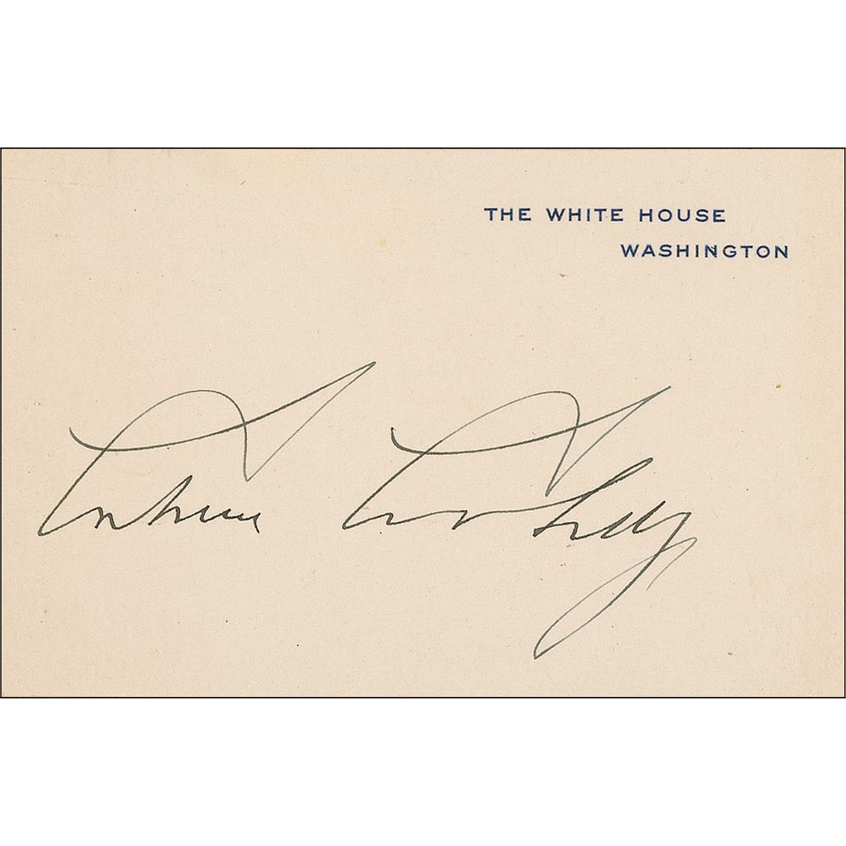 White House card, 4.25 x 2.75, signed in ink, “Calvin Coolidge.” Uniform toning, a few trivial spots of foxing, and a faint paperclip impression towards the top left corner, otherwise fine condition. Accompanied by a signature of his vice president, Charles Dawes.